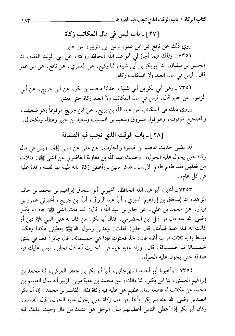 7351 - وَذَلِكَ فِيمَا أَجَازَ لِي أَبُو عَبْدِ اللهِ الْحَافِظُ رِوَايَتَهُ عَنْ أَبِي الْوَلِيدِ الْفَقِيهِ، ثنا الْحَسَنُ بْنُ سُفْيَانَ، ثنا أَبُو بَكْرِ بْنُ أَبِي شَيْبَةَ، ثنا وَكِيعٌ، عَنِ الْعُمَرِيِّ، عَنْ نَافِعٍ، عَنِ ابْنِ عُمَرَ قَالَ: §" لَيْسَ فِي مَالِ الْعَبْدِ وَلَا الْمُكَاتَبِ زَكَاةٌ "
