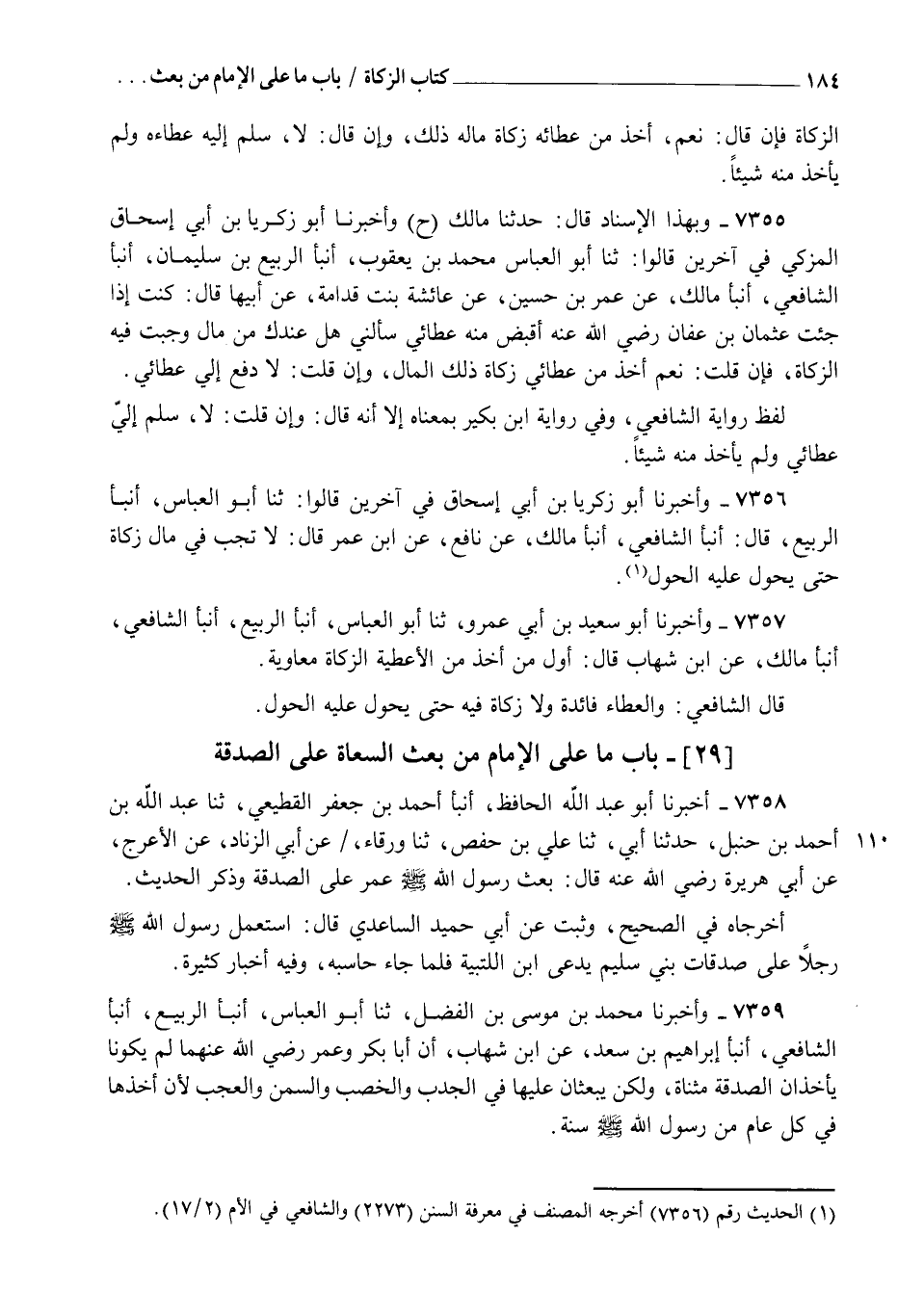 7359 - وَأَخْبَرَنَا مُحَمَّدُ بْنُ مُوسَى بْنِ الْفَضْلِ، ثنا أَبُو الْعَبَّاسِ، أنبأ الرَّبِيعُ، أنبأ الشَّافِعِيُّ، أنبأ إِبْرَاهِيمُ بْنُ سَعْدٍ، عَنِ ابْنِ شِهَابٍ، أَنَّ أَبَا بَكْرٍ، وَعُمَرَ، رَضِيَ اللهُ عَنْهُمَا §لَمْ يَكُونَا يَأْخُذَانِ الصَّدَقَةَ مُثَنَّاةً وَلَكِنْ يَبْعَثَانِ عَلَيْهَا فِي الْجَدْبِ وَالْخَصْبِ وَالسِّمَنِ وَالْعَجْبِ؛ لِأَنَّ أَخْذَهَا فِي كُلِّ عَامٍ مِنْ رَسُولِ اللهِ صَلَّى اللهُ عَلَيْهِ وَسَلَّمَ سُنَّةٌ -[185]- وَرَوَاهُ فِي الْقَدِيمِ عَنْ إِبْرَاهِيمَ وَزَادَ فِيهِ: وَلَا يُضَمِّنُونَهَا أَهْلَهَا وَلَا يُؤَخِّرُونَ أَخْذَهَا عَنْ كُلِّ عَامٍ
