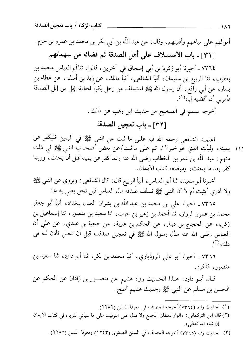 7366 - أَخْبَرَنَا أَبُو عَلِيٍّ الرُّذْبَارِيُّ، أنبأ مُحَمَّدُ بْنُ بَكْرٍ، ثنا أَبُو دَاوُدَ، ثنا سَعِيدُ بْنُ مَنْصُورٍ فَذَكَرَهُ. قَالَ أَبُو دَاوُدَ هَذَا الْحَدِيثُ رَوَاهُ هُشَيْمٌ عَنْ مَنْصُورِ بْنِ زَاذَانَ، عَنِ الْحَكَمِ، عَنِ الْحَسَنِ بْنِ مُسْلِمٍ، عَنِ النَّبِيِّ صَلَّى اللهُ عَلَيْهِ وَسَلَّمَ , وَحَدِيثُ هُشَيْمٍ أَصَحُّ. -[187]- قَالَ الشَّيْخُ: هَذَا حَدِيثٌ مُخْتَلَفٌ فِيهِ عَلَى الْحَكَمِ بْنِ عُتَيْبَةَ فَرَوَاهُ إِسْمَاعِيلُ بْنُ زَكَرِيَّا عَنْ حَجَّاجٍ عَنِ الْحَكَمِ هَكَذَا، وَخَالَفَهُ إِسْرَائِيلُ عَنْ حَجَّاجٍ فَقَالَ: عَنِ الْحَكَمِ عَنْ حُجْرٍ الْعَدَوِيِّ عَنْ عَلِيٍّ , وَخَالَفَهُ فِي لَفْظِهِ فَقَالَ: قَالَ رَسُولُ اللهِ صَلَّى اللهُ عَلَيْهِ وَسَلَّمَ لِعُمَرَ: " إِنَّا قَدْ أَخَذْنَا مِنَ الْعَبَّاسِ زَكَاةَ الْعَامِ عَامَ الْأَوَّلِ " وَرَوَاهُ مُحَمَّدُ بْنُ عُبَيْدِ اللهِ هُوَ الْعَرْزَمِيُّ عَنِ الْحَكَمِ عَنْ مِقْسَمٍ عَنِ ابْنِ عَبَّاسٍ فِي قِصَّةِ عُمَرَ وَالْعَبَّاسِ رَضِيَ اللهُ عَنْهُمَا. وَرَوَاهُ الْحَسَنُ بْنُ عُمَارَةَ عَنِ الْحَكَمِ عَنْ مُوسَى بْنِ طَلْحَةَ عَنْ طَلْحَةَ وَرَوَاهُ هُشَيْمٌ عَنْ مَنْصُورِ بْنِ زَاذَانَ عَنِ الْحَكَمِ عَنِ الْحَسَنِ بْنِ مُسْلِمٍ عَنِ النَّبِيِّ صَلَّى اللهُ عَلَيْهِ وَسَلَّمَ مُرْسَلًا أَنَّهُ قَالَ لِعُمَرَ رَضِيَ اللهُ عَنْهُ فِي هَذِهِ الْقِصَّةِ: " إِنَّا كُنَّا قَدْ تَعَجَّلْنَا صَدَقَةَ مَالِ الْعَبَّاسِ لِعَامِنَا هَذَا عَامَ أَوَّلَ " وَهَذَا هُوَ الْأَصَحُّ مِنْ هَذِهِ الرِّوَايَاتِ وَرُوِيَ عَنْ عَلِيٍّ رَضِيَ اللهُ عَنْهُ مِنْ وَجْهٍ آخَرَ مَرْفُوعًا