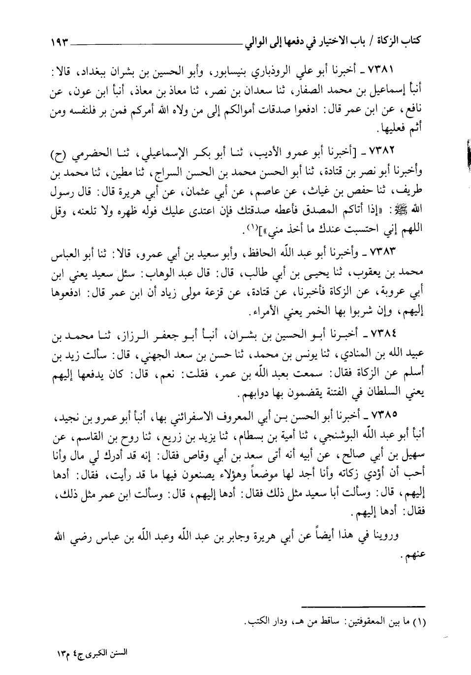 7381 - أَخْبَرَنَا أَبُو عَلِيٍّ الرُّوذْبَارِيُّ، بِنَيْسَابُورَ وَأَبُو الْحُسَيْنِ بْنُ بِشْرَانَ بِبَغْدَادَ , قَالَا: أنبأ إِسْمَاعِيلُ بْنُ مُحَمَّدٍ الصَّفَّارُ، ثنا سَعْدَانُ بْنُ نَصْرٍ، ثنا مُعَاذُ بْنُ مُعَاذٍ، أنبأ ابْنُ عَوْنٍ، عَنْ نَافِعٍ، عَنِ ابْنِ عُمَرَ قَالَ: §" ادْفَعُوا صَدَقَاتِ أَمْوَالِكُمْ إِلَى مَنْ وَلَّاهُ اللهُ أَمْرَكُمْ فَمَنْ بَرَّ فَلِنَفْسِهِ وَمَنْ أَثِمَ فَعَلَيْهَا "