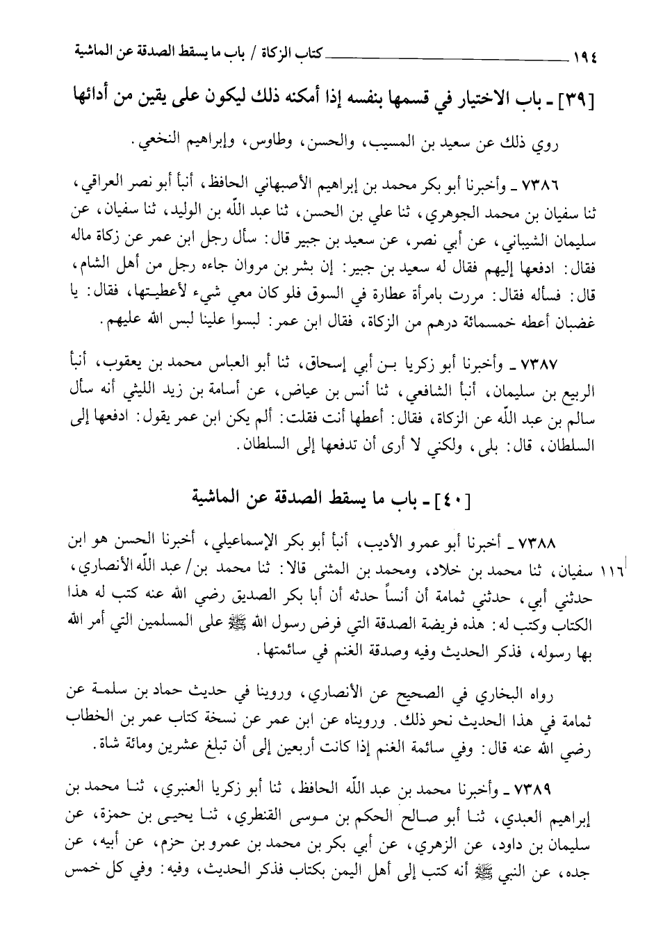 7386 - وَأَخْبَرَنَا أَبُو بَكْرٍ مُحَمَّدُ بْنُ إِبْرَاهِيمَ الْأَصْبَهَانِيُّ الْحَافِظُ أنبأ أَبُو نَصْرٍ الْعِرَاقِيُّ، ثنا سُفْيَانُ بْنُ مُحَمَّدٍ الْجَوْهَرِيُّ، ثنا عَلِيُّ بْنُ الْحَسَنِ، ثنا عَبْدُ اللهِ بْنُ الْوَلِيدِ، ثنا سُفْيَانُ، عَنْ سُلَيْمَانَ الشَّيْبَانِيِّ، عَنْ أَبِي نَصْرٍ، عَنْ سَعِيدِ بْنِ جُبَيْرٍ، قَالَ سَأَلَ رَجُلٌ ابْنَ عُمَرَ عَنْ زَكَاةِ مَالِهِ فَقَالَ: " §ادْفَعْهَا إِلَيْهِمْ "، فَقَالَ لَهُ سَعِيدُ بْنُ جُبَيْرٍ: إِنَّ بِشْرَ بْنَ مَرْوَانَ جَاءَهُ رَجُلٌ مِنَ أَهْلِ الشَّامِ , قَالَ فَسَأَلَهُ فَقَالَ: مَرَرْتُ بِامْرَأَةٍ عَطَّارَةٍ فِي السُّوقِ فَلَوْ كَانَ مَعِي شَيْءٌ لَأَعْطَيْتُهَا فَقَالَ: يَا غَضْبَانُ , أَعْطِهِ خَمْسَمِائَةَ دِرْهَمٍ مِنَ الزَّكَاةِ، فَقَالَ ابْنُ عُمَرَ: " لَبَّسُوا عَلَيْنَا لَبَّسَ اللهُ عَلَيْهِمْ "