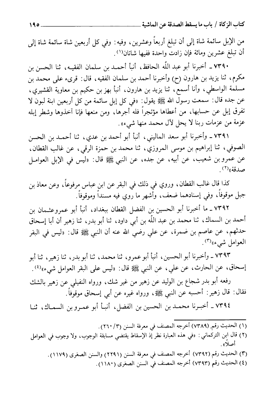 7393 - وَأَخْبَرَنَا أَبُو الْحُسَيْنِ، أنبأ أَبُو عَمْرٍو، ثنا مُحَمَّدٌ، ثنا أَبُو بَدْرٍ، ثنا زُهَيْرٌ، ثنا أَبُو إِسْحَاقَ، عَنِ الْحَارِثِ، عَنْ عَلِيٍّ عَنِ النَّبِيِّ صَلَّى اللهُ عَلَيْهِ وَسَلَّمَ قَالَ: §" لَيْسَ عَلَى الْبَقَرِ الْعَوَامِلِ شَيْءٌ ". رَفَعَهُ أَبُو بَدْرٍ شُجَاعُ بْنُ الْوَلِيدِ عَنْ زُهَيْرٍ مِنْ غَيْرِ شَكٍّ , وَرَوَاهُ النُّفَيْلِيُّ عَنْ زُهَيْرٍ بِالشَّكِّ فَقَالَ: قَالَ زُهَيْرٌ: أَحْسِبُهُ عَنِ النَّبِيِّ صَلَّى اللهُ عَلَيْهِ وَسَلَّمَ وَرَوَاهُ غَيْرُهُ عَنْ أَبِي إِسْحَاقَ مَوْقُوفًا