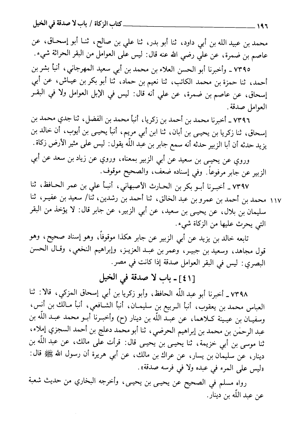 7397 - أَخْبَرَنَا أَبُو بَكْرِ بْنُ الْحَارِثِ الْأَصْبَهَانِيُّ، أنبأ عَلِيُّ بْنُ عُمَرَ الْحَافِظُ، ثنا مُحَمَّدُ بْنُ أَحْمَدَ بْنِ عَمْرِو بْنِ عَبْدِ الْخَالِقِ، ثنا أَحْمَدُ بْنُ رِشْدِينَ، ثنا سَعِيدُ بْنُ عُفَيْرٍ، ثنا سُلَيْمَانُ بْنُ بِلَالٍ، عَنْ يَحْيَى بْنِ سَعِيدٍ، عَنْ أَبِي الزُّبَيْرِ، عَنْ جَابِرٍ قَالَ: §" لَا يُؤْخَذُ مِنَ الْبَقَرِ الَّتِي يُحْرَثُ عَلَيْهَا مِنَ الزَّكَاةِ شَيْءٌ ". تَابَعَهُ خَالِدُ بْنُ يَزِيدَ عَنْ أَبِي الزُّبَيْرِ عَنْ جَابِرٍ هَكَذَا مَوْقُوفًا، وَهُوَ إِسْنَادٌ صَحِيحٌ وَهُوَ قَوْلُ مُجَاهِدٍ وَسَعِيدِ بْنِ جُبَيْرٍ وَعُمَرَ بْنِ عَبْدِ الْعَزِيزِ وَإِبْرَاهِيمَ النَّخَعِيِّ وَقَالَ الْحَسَنُ الْبَصْرِيُّ: لَيْسَ فِي الْبَقَرِ الْعَوَامِلِ صَدَقَةٌ إِذَا كَانَتْ فِي مِصْرٍ