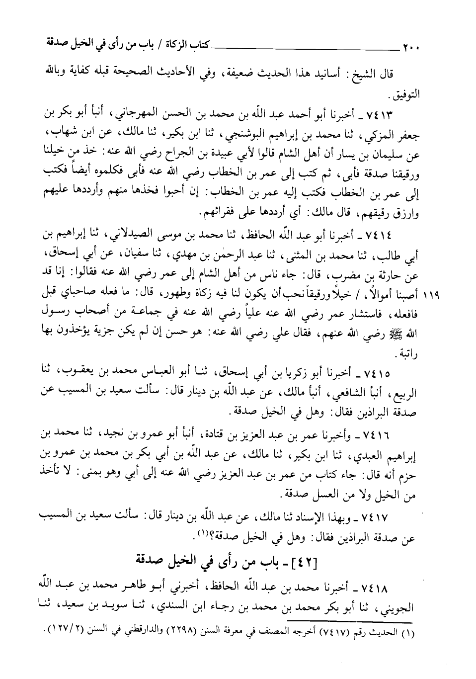 7413 - أَخْبَرَنَا أَبُو أَحْمَدَ عَبْدُ اللهِ بْنُ مُحَمَّدِ بْنِ الْحَسَنِ الْمِهْرَجَانِيُّ، أنبأ أَبُو بَكْرِ بْنُ جَعْفَرٍ الْمُزَكِّي، ثنا مُحَمَّدُ بْنُ إِبْرَاهِيمَ الْبُوشَنْجِيُّ، ثنا ابْنُ بُكَيْرٍ، ثنا مَالِكٌ، عَنِ ابْنِ شِهَابٍ، عَنْ سُلَيْمَانَ بْنِ يَسَارٍ أَنَّ أَهْلَ الشَّامِ، قَالُوا لِأَبِي عُبَيْدَةَ بْنِ الْجَرَّاحِ رَضِيَ اللهُ عَنْهُ: خُذْ مِنْ خَيْلِنَا وَرَقِيقِنَا صَدَقَةً , فَأَبَى ثُمَّ كَتَبَ إِلَى عُمَرَ بْنِ الْخَطَّابِ رَضِيَ اللهُ عَنْهُ فَأَبَى فَكَلَّمُوهُ أَيْضًا فَكَتَبَ إِلَى عُمَرَ بْنِ الْخَطَّابِ فَكَتَبَ إِلَيْهِ عُمَرُ بْنُ الْخَطَّابِ: §" إِنْ أَحَبُّوا فَخُذْهَا مِنْهُمْ وَارْدُدْهَا عَلَيْهِمْ وَارْزُقْ رَقِيقَهُمْ " قَالَ مَالِكٌ: أَيِ ارْدُدْهَا عَلَى فُقَرَائِهِمْ