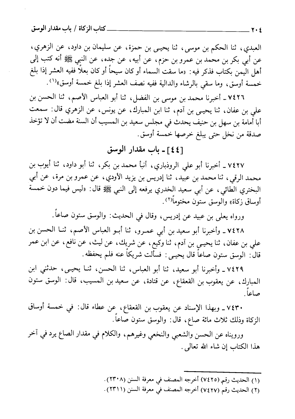 7427 - أَخْبَرَنَا أَبُو عَلِيٍّ الرُّوذْبَارِيُّ، أنبأ مُحَمَّدُ بْنُ بَكْرٍ، ثنا أَبُو دَاوُدَ، ثنا أَيُّوبُ بْنُ مُحَمَّدٍ الرَّقِّيُّ، ثنا مُحَمَّدُ بْنُ عُبَيْدٍ، ثنا إِدْرِيسُ بْنُ يَزِيدَ الْأَوْدِيُّ، عَنْ عَمْرِو بْنِ مُرَّةَ، عَنْ أَبِي الْبَخْتَرِيِّ الطَّائِيِّ، عَنْ أَبِي سَعِيدٍ الْخُدْرِيِّ، يَرْفَعُهُ إِلَى النَّبِيِّ صَلَّى اللهُ عَلَيْهِ وَسَلَّمَ قَالَ: §" لَيْسَ فِيمَا دُونَ خَمْسَةِ أَوْسَاقٍ زَكَاةٌ ". وَالْوَسْقُ سِتُّونَ مَخْتُومًا وَرَوَاهُ يَعْلَى بْنُ عُبَيْدٍ عَنْ إِدْرِيسَ وَقَالَ فِي الْحَدِيثِ وَالْوَسْقُ سِتُّونَ صَاعًا