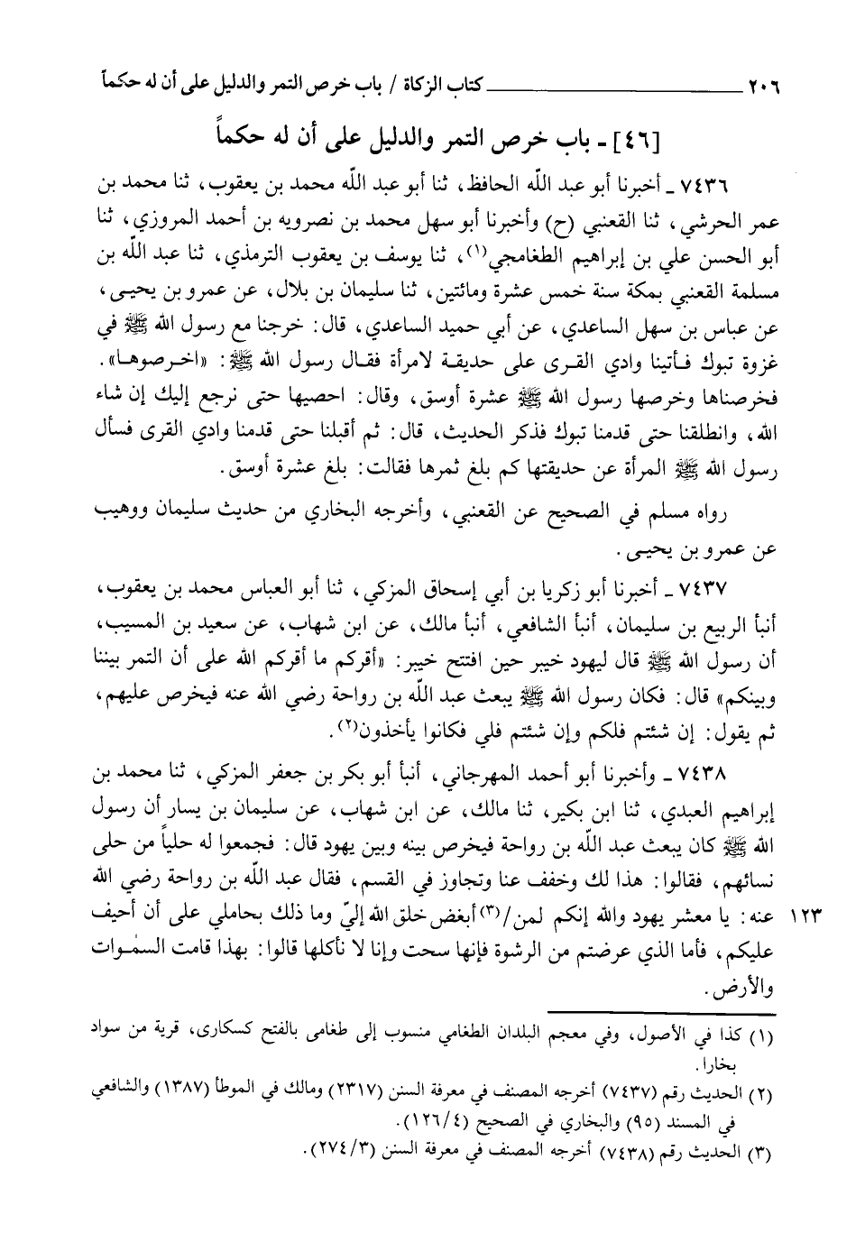 7436 - أَخْبَرَنَا أَبُو عَبْدِ اللهِ الْحَافِظُ، ثنا أَبُو عَبْدِ اللهِ مُحَمَّدُ بْنُ يَعْقُوبَ , ثنا مُحَمَّدُ بْنُ عُمَرَ الْحَرَشِيُّ، ثنا الْقَعْنَبِيُّ، ح وَأَخْبَرَنَا أَبُو سَهْلٍ مُحَمَّدُ بْنُ نَصْرَوَيْهِ بْنِ أَحْمَدَ الْمَرْوَزِيُّ ثنا أَبُو الْحَسَنِ عَلِيُّ بْنُ إِبْرَاهِيمَ الطَّغَامَجِيُّ. ثنا يُوسُفُ بْنُ يَعْقُوبَ التِّرْمِذِيُّ، ثنا عَبْدُ اللهِ بْنُ مَسْلَمَةَ الْقَعْنَبِيُّ، بِمَكَّةَ , سَنَةَ خَمْسَ عَشْرَةَ وَمِائَتَيْنِ , ثنا سُلَيْمَانُ بْنُ بِلَالٍ , عَنْ عَمْرِو بْنِ يَحْيَى , عَنْ عَبَّاسِ بْنِ سَهْلٍ السَّاعِدِيِّ , عَنْ أَبِي حُمَيْدٍ السَّاعِدِيِّ قَالَ: خَرَجْنَا مَعَ رَسُولِ اللهِ صَلَّى اللهُ عَلَيْهِ وَسَلَّمَ فِي غَزْوَةِ تَبُوكَ , فَأَتَيْنَا وَادِيَ الْقُرَى عَلَى حَدِيقَةٍ لِامْرَأَةٍ , فَقَالَ رَسُولُ اللهِ صَلَّى اللهُ عَلَيْهِ وَسَلَّمَ: §" اخْرُصُوهَا " فَخَرَصْنَاهَا وَخَرَصَهَا رَسُولُ اللهِ صَلَّى اللهُ عَلَيْهِ وَسَلَّمَ عَشَرَةَ أَوْسُقٍ وَقَالَ: " أَحْصِيهَا حَتَّى نَرْجِعَ إِلَيْكِ إِنْ شَاءَ اللهُ " , وَانْطَلَقْنَا حَتَّى قَدِمْنَا تَبُوكَ، فَذَكَرَ الْحَدِيثَ قَالَ: ثُمَّ أَقْبَلْنَا حَتَّى قَدِمْنَا وَادِيَ الْقُرَى فَسَأَلَ رَسُولُ اللهِ صَلَّى اللهُ عَلَيْهِ وَسَلَّمَ الْمَرْأَةَ عَنْ حَدِيقَتِهَا كَمْ بَلَغَ ثَمَرُهَا؟ فَقَالَتْ بَلَغَ عَشَرَةَ أَوْسُقٍ. رَوَاهُ مُسْلِمٌ فِي الصَّحِيحِ عَنِ الْقَعْنَبِيِّ وَأَخْرَجَهُ الْبُخَارِيُّ مِنْ حَدِيثِ سُلَيْمَانَ وَوُهَيْبٍ عَنْ عَمْرِو بْنِ يَحْيَى
