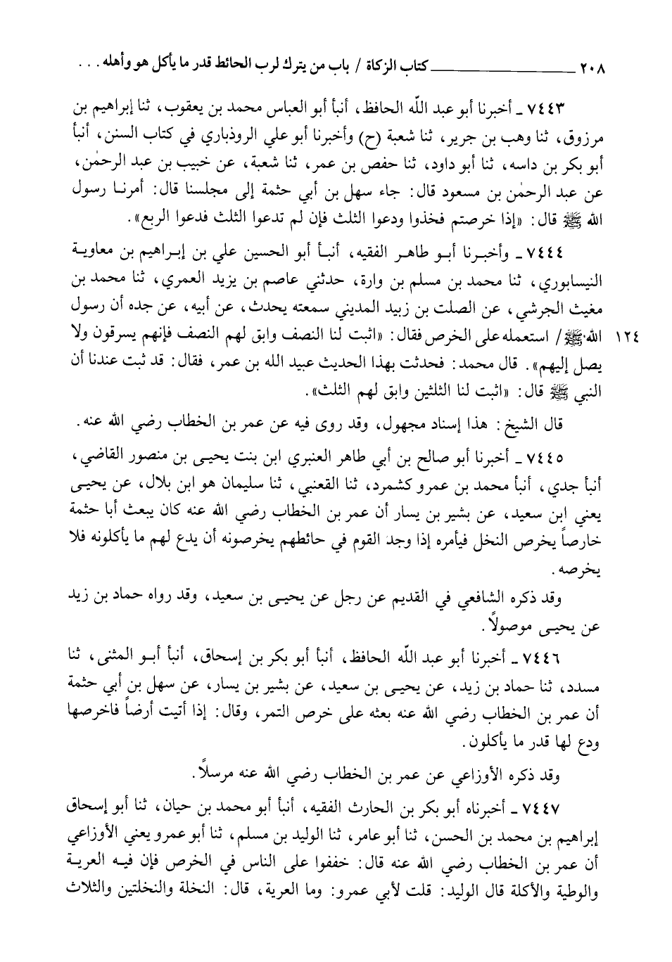 7447 - أَخْبَرَنَاهُ أَبُو بَكْرِ بْنُ الْحَارِثِ الْفَقِيهُ، أنبأ أَبُو مُحَمَّدِ بْنُ حَيَّانَ، ثنا أَبُو إِسْحَاقَ إِبْرَاهِيمُ بْنُ مُحَمَّدِ بْنِ الْحَسَنِ , ثنا أَبُو عَامِرٍ، ثنا الْوَلِيدُ بْنُ مُسْلِمٍ، ثنا أَبُو عَمْرٍو يَعْنِي الْأَوْزَاعِيَّ، أَنَّ عُمَرَ بْنَ الْخَطَّابِ رَضِيَ اللهُ عَنْهُ قَالَ: §" خَفِّفُوا عَلَى النَّاسِ فِي الْخَرْصِ فَإِنَّ فِيهِ الْعَرِيَّةَ وَالْوَطِيَّةَ وَالْأَكَلَةَ " قَالَ الْوَلِيدُ: قُلْتُ: لِأَبِي عَمْرٍو وَمَا الْعَرِيَّةُ؟ قَالَ: النَّخْلَةُ وَالنَّخْلَتَانِ وَالثَّلَاثُ -[209]- يَمْنَحُهَا الرَّجُلُ الرَّجُلَ مِنْ أَهْلِ الْحَاجَةِ، قُلْتُ: فَمَا الْأَكَلَةُ؟ قَالَ: أَهْلُ الْمَالِ يَأْكُلُونَ مِنْهُ رُطَبًا فَلَا يُخْرَصُ ذَلِكَ وَيُوضَعُ مِنْ خَرْصِهِ، قَالَ: قُلْتُ: فَمَا الْوَطِيَّةُ؟ قَالَ: مَنْ يَغْشَاهُمْ وَيَزُورُهُمْ قَالَ الشَّيْخُ: وَهَذَا اللَّفْظُ الَّذِي رَوَاهُ الْأَوْزَاعِيُّ عَنْ عُمَرَ رَضِيَ اللهُ عَنْهُ فِي التَّخْفِيفِ قَدْ رَوَاهُ مَكْحُولٌ عَنِ النَّبِيِّ صَلَّى اللهُ عَلَيْهِ وَسَلَّمَ مُرْسَلًا , وَقَدْ رُوِيَ فِي هَذَا حَدِيثٌ مُسْنَدٌ بِإِسْنَادٍ غَيْرِ قَوِيٍّ