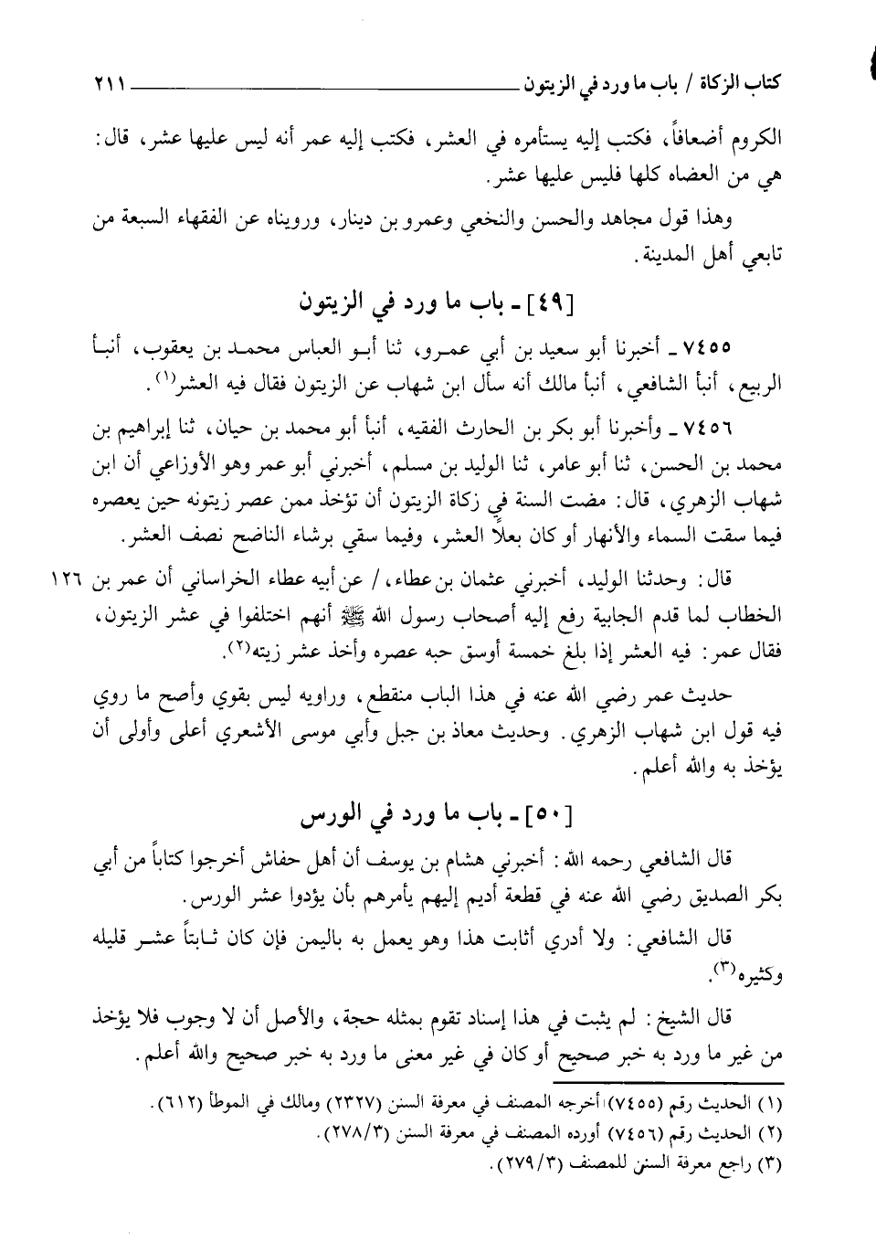 7455 - أَخْبَرَنَا أَبُو سَعِيدِ بْنُ أَبِي عَمْرٍو، ثنا أَبُو الْعَبَّاسِ مُحَمَّدُ بْنُ يَعْقُوبَ أنبأ الرَّبِيعُ، أنبأ الشَّافِعِيُّ، أنبأ مَالِكٌ، أنَّهُ §سَأَلَ ابْنَ شِهَابٍ عَنِ الزَّيْتُونِ , فَقَالَ: " فِيهِ الْعُشْرُ "