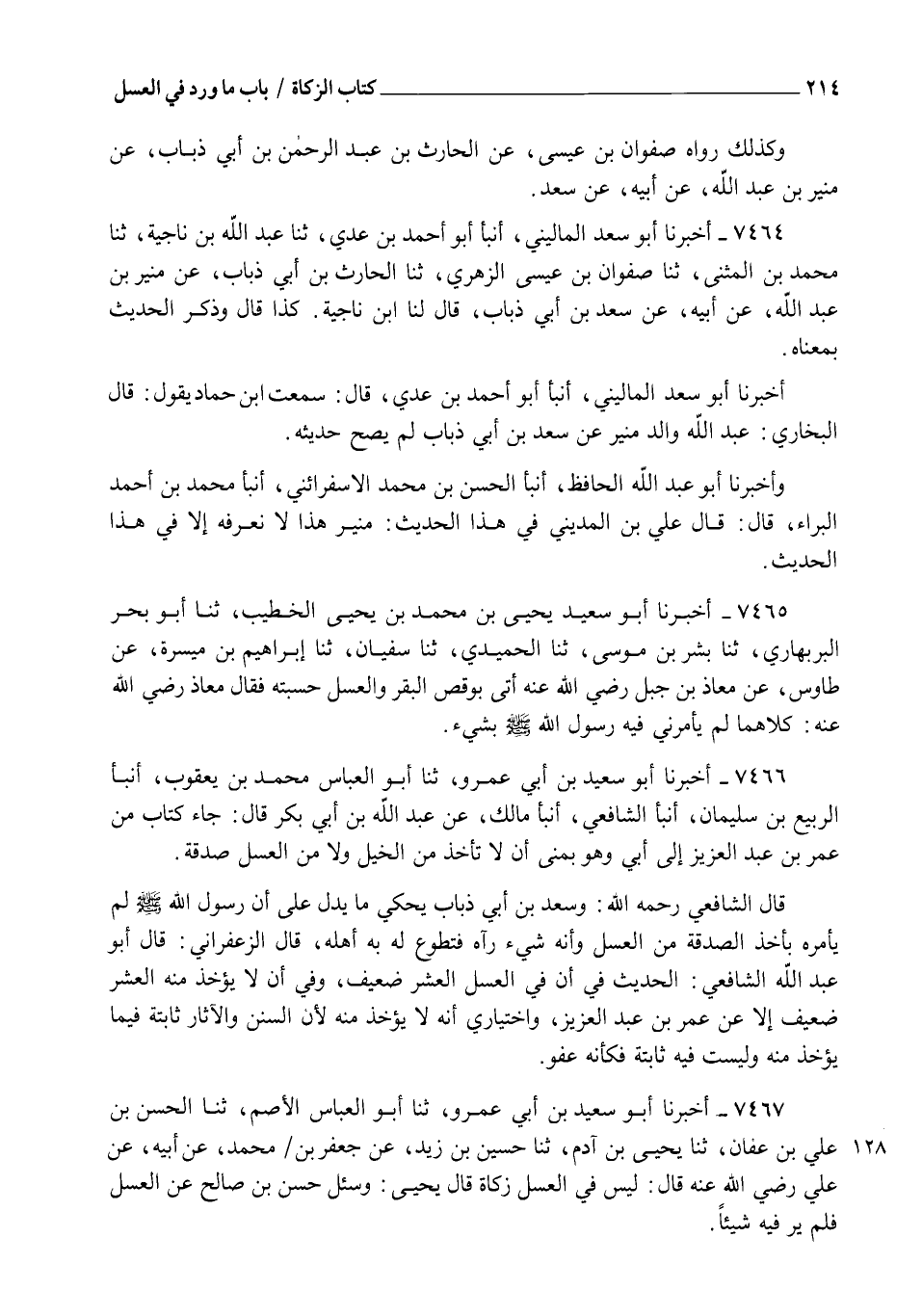 7466 - أَخْبَرَنَا أَبُو سَعِيدِ بْنُ أَبِي عَمْرٍو، ثنا أَبُو الْعَبَّاسِ مُحَمَّدُ بْنُ يَعْقُوبَ , أنبأ الرَّبِيعُ بْنُ سُلَيْمَانَ، أنبأ الشَّافِعِيُّ، أنبأ مَالِكٌ، عَنِ عَبْدِ اللهِ بْنِ أَبِي بَكْرٍ قَالَ: جَاءَ كِتَابٌ مِنْ عُمَرَ بْنِ عَبْدِ الْعَزِيزِ إِلَى أَبِي وَهُوَ بِمِنًى أَنْ §" لَا تَأْخُذْ مِنَ الْخَيْلِ وَلَا مِنَ الْعَسَلِ صَدَقَةً " قَالَ الشَّافِعِيُّ رَحِمَهُ اللهُ: وَسَعْدُ بْنُ أَبِي ذُبَابٍ يَحْكِي مَا يَدُلُّ عَلَى أَنَّ رَسُولَ اللهِ صَلَّى اللهُ عَلَيْهِ وَسَلَّمَ لَمْ يَأْمُرْهُ بِأَخْذِ الصَّدَقَةِ مِنَ الْعَسَلِ وَأنَّهُ شَيْءٌ رَآهُ فَتَطَوَّعَ لَهُ بِهِ أَهْلُهُ. قَالَ الزَّعْفَرَانِيُّ: قَالَ أَبُو عَبْدِ اللهِ الشَّافِعِيُّ: الْحَدِيثُ فِي أَنَّ فِي الْعَسَلِ الْعُشْرَ ضَعِيفٌ وَفِي أَنْ لَا يُؤْخَذَ مِنْهُ الْعُشْرُ ضَعِيفٌ , إِلَّا عَنْ عُمَرَ بْنِ عَبْدِ الْعَزِيزِ وَاخْتِيَارِي أنَّهُ لَا يُؤْخَذُ مِنْهُ لِأَنَّ السُّنَنَ وَالْآثَارَ ثَابِتَةٌ فِيمَا يُؤْخَذُ مِنْهُ وَلَيْسَتْ فِيهِ ثَابِتَةٌ فَكَأنَّهُ عَفْوٌ
