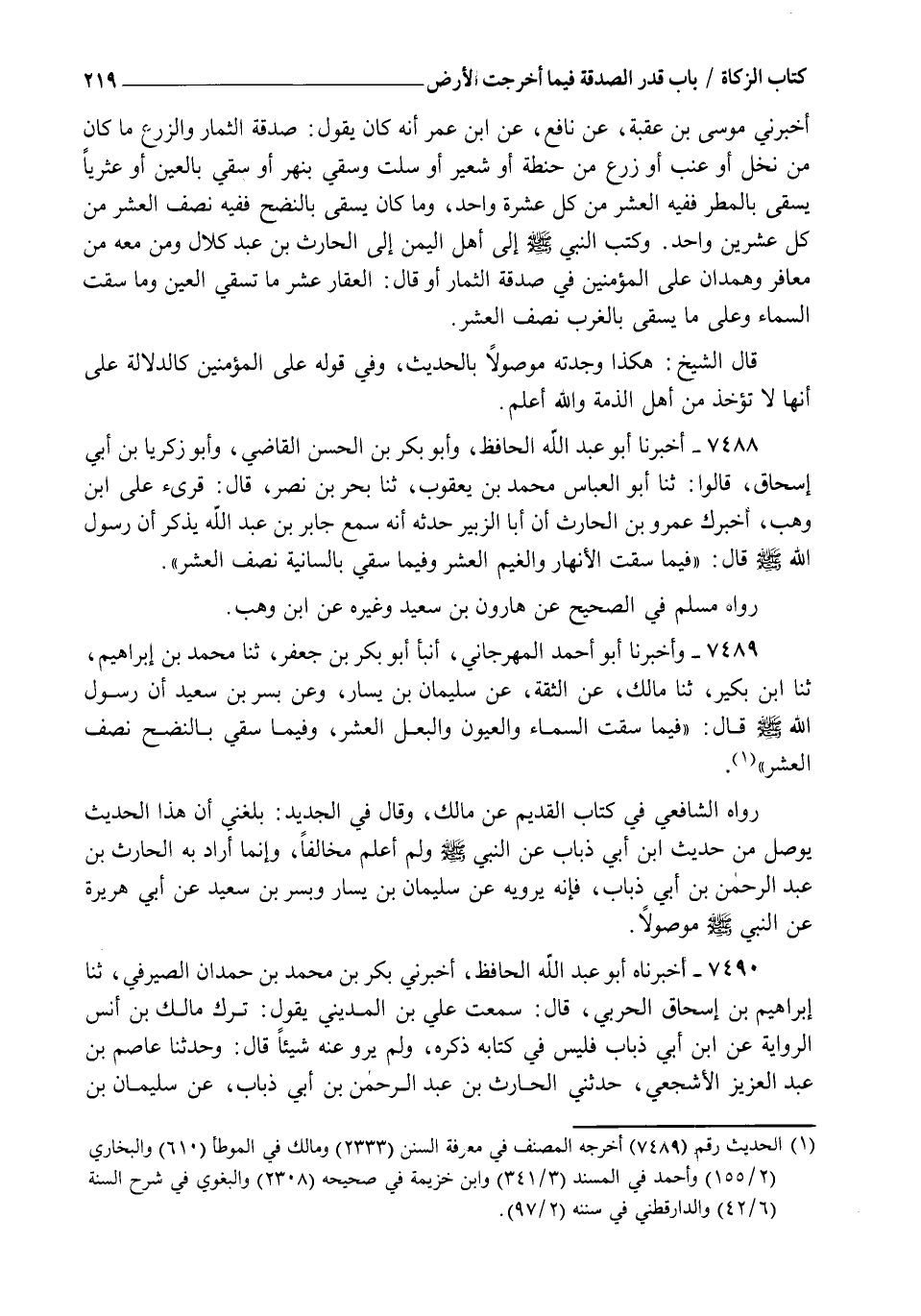 7489 - وَأَخْبَرَنَا أَبُو أَحْمَدَ الْمِهْرَجَانِيُّ، أنبأ أَبُو بَكْرِ بْنُ جَعْفَرٍ، ثنا مُحَمَّدُ بْنُ إِبْرَاهِيمَ، ثنا ابْنُ بُكَيْرٍ، ثنا مَالِكٌ، عَنِ الثِّقَةِ , عَنْ سُلَيْمَانَ بْنِ يَسَارٍ، وَعَنْ بُسْرِ بْنِ سَعِيدٍ، أَنَّ رَسُولَ اللهِ صَلَّى اللهُ عَلَيْهِ وَسَلَّمَ قَالَ: §" فِيمَا سَقَتِ السَّمَاءُ وَالْعُيُونُ وَالْبَعْلُ الْعُشْرُ وَفِيمَا سُقِيَ بِالنَّضْحِ نِصْفُ الْعُشْرِ " رَوَاهُ الشَّافِعِيُّ فِي كِتَابِ الْقَدِيمِ عَنْ مَالِكٍ وَقَالَ فِي الْجَدِيدِ: بَلَغَنِي أَنَّ هَذَا الْحَدِيثَ يُوصَلُ مِنْ حَدِيثِ ابْنِ أَبِي ذُبَابٍ عَنِ النَّبِيِّ صَلَّى اللهُ عَلَيْهِ وَسَلَّمَ وَلَمْ أَعْلَمْ مُخَالِفًا وَإِنَّمَا أَرَادَ بِهِ الْحَارِثَ بْنَ عَبْدِ الرَّحْمَنِ بْنِ أَبِي ذُبَابٍ فَإِنَّهُ يَرْوِيهِ عَنْ سُلَيْمَانَ بْنِ يَسَارٍ وَبُسْرِ بْنِ سَعِيدٍ عَنْ أَبِي هُرَيْرَةَ عَنِ النَّبِيِّ صَلَّى اللهُ عَلَيْهِ وَسَلَّمَ مَوْصُولًا