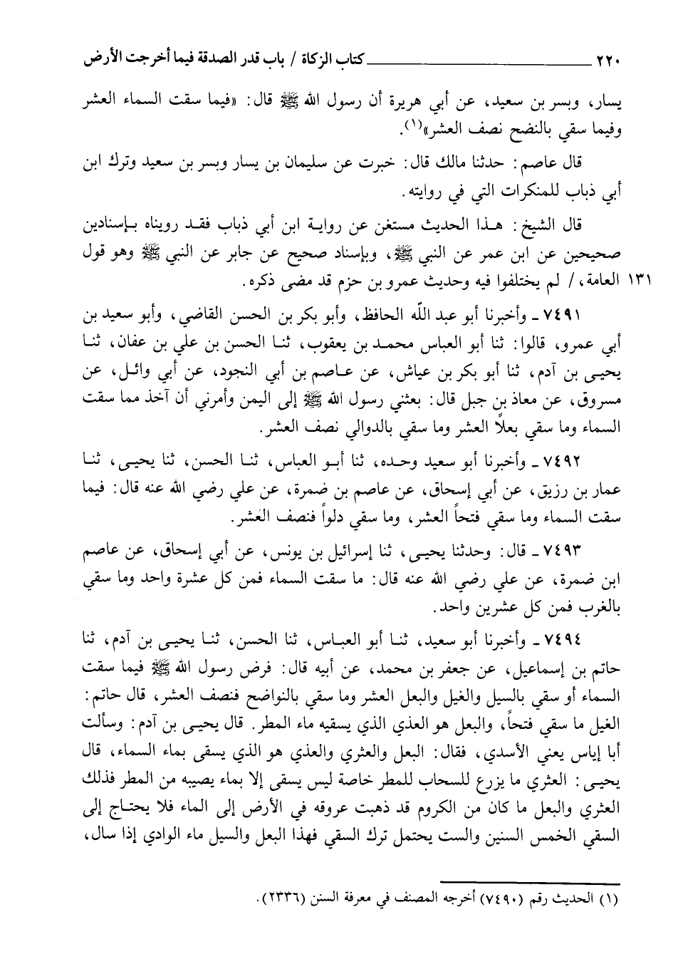 7492 - وَأَخْبَرَنَا أَبُو سَعِيدٍ وَحْدَهُ، ثنا أَبُو الْعَبَّاسِ، ثنا الْحَسَنُ، ثنا يَحْيَى، ثنا عَمَّارُ بْنُ رُزَيْقٍ، عَنْ أَبِي إِسْحَاقَ، عَنْ عَاصِمِ بْنِ ضَمْرَةَ، عَنْ عَلِيٍّ رَضِيَ اللهُ عَنْهُ قَالَ: §" فِيمَا سَقَتِ السَّمَاءُ وَمَا سُقِيَ فَتْحًا الْعُشْرُ وَمَا سُقِيَ دَلْوًا فَنِصْفُ الْعُشْرِ "