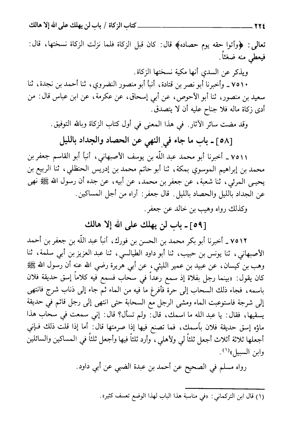 7512 - أَخْبَرَنَا أَبُو بَكْرٍ مُحَمَّدُ بْنُ الْحَسَنِ بْنِ فُورَكٍ أنبأ عَبْدُ اللهِ بْنُ جَعْفَرِ بْنِ أَحْمَدَ الْأَصْبَهَانِيُّ، ثنا يُونُسُ بْنُ حَبِيبٍ، ثنا أَبُو دَاوُدَ الطَّيَالِسِيُّ، ثنا عَبْدُ الْعَزِيزِ بْنُ أَبِي سَلَمَةَ، ثنا وَهْبُ بْنُ كَيْسَانَ، عَنْ عُبَيْدِ بْنِ عُمَيْرٍ اللَّيْثِيِّ، عَنْ أَبِي هُرَيْرَةَ رَضِيَ اللهُ عَنْهُ أَنَّ رَسُولَ اللهِ صَلَّى اللهُ عَلَيْهِ وَسَلَّمَ كَانَ يَقُولُ: §" بَيْنَمَا رَجُلٌ بِفَلَاةٍ إِذْ سَمِعَ رَعْدًا فِي سَحَابٍ , فَسَمِعَ فِيهِ كَلَامًا اسْقِ حَدِيقَةَ فُلَانٍ بِاسْمِهِ فَجَاءَ ذَلِكَ السَّحَابُ إِلَى حَرَّةٍ فَأَفْرَغَ مَا فِيهِ مِنَ الْمَاءِ , ثُمَّ جَاءَ إِلَى ذُنَابِ شَرْجٍ فَانْتَهَى إِلَى شَرْجَةٍ فَاسْتَوْعَبَتِ الْمَاءَ وَمَشَى الرَّجُلُ مَعَ السَّحَابَةِ حَتَّى انْتَهَى إِلَى رَجُلٍ قَائِمٍ فِي حَدِيقَةٍ يَسْقِيهَا , فَقَالَ: يَا عَبْدَ اللهِ مَا اسْمُكَ؟ قَالَ: وَلِمَ تَسْأَلُ؟ قَالَ: إِنِّي سَمِعْتُ فِي سَحَابٍ هَذَا مَاؤُهُ اسْقِ حَدِيقَةَ فُلَانٍ بِاسْمِكَ فَمَا تَصْنَعُ فِيهَا إِذَا صَرَمْتَهَا؟ قَالَ: أَمَا إِذْ قُلْتَ ذَلِكَ فَإِنِّي أَجْعَلُهَا ثَلَاثَةَ أَثْلَاثٍ أَجْعَلُ ثُلُثًا لِي وَلِأَهْلِي , وَأَرُدُّ ثُلُثًا فِيهَا , وَأَجْعَلُ ثُلُثًا فِي الْمَسَاكِينِ وَالسَّائِلِينَ وَابْنِ السَّبِيلِ ". رَوَاهُ مُسْلِمٌ فِي الصَّحِيحِ عَنْ أَحْمَدَ بْنِ عَبْدَةَ الضَّبِّيِّ عَنْ أَبِي دَاوُدَ