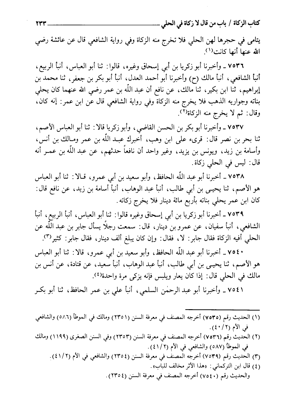 7536 - وَأَخْبَرَنَا أَبُو زَكَرِيَّا بْنُ أَبِي إِسْحَاقَ وَغَيْرُهُ، قَالُوا: ثنا أَبُو الْعَبَّاسِ، أنبأ الرَّبِيعُ، أنبأ الشَّافِعِيُّ، أنبأ مَالِكٌ، ح وَأَخْبَرَنَا أَبُو أَحْمَدَ الْعَدْلُ، أنبأ أَبُو بَكْرِ بْنُ جَعْفَرٍ، ثنا مُحَمَّدُ بْنُ إِبْرَاهِيمَ، ثنا ابْنُ بُكَيْرٍ، ثنا مَالِكٌ، عَنْ نَافِعٍ، أَنَّ عَبْدَ اللهِ بْنَ عُمَرَ رَضِيَ اللهُ عَنْهُمَا §كَانَ يُحَلِّي بَنَاتِهِ وَجَوَارِيَهُ الذَّهَبَ فَلَا يُخْرِجُ مِنْهُ الزَّكَاةَ. وَفِي رِوَايَةِ الشَّافِعِيِّ قَالَ عَنِ ابْنِ عُمَرَ إِنَّهُ كَانَ , وَقَالَ: ثُمَّ لَا يُخْرِجُ مِنْهُ الزَّكَاةَ