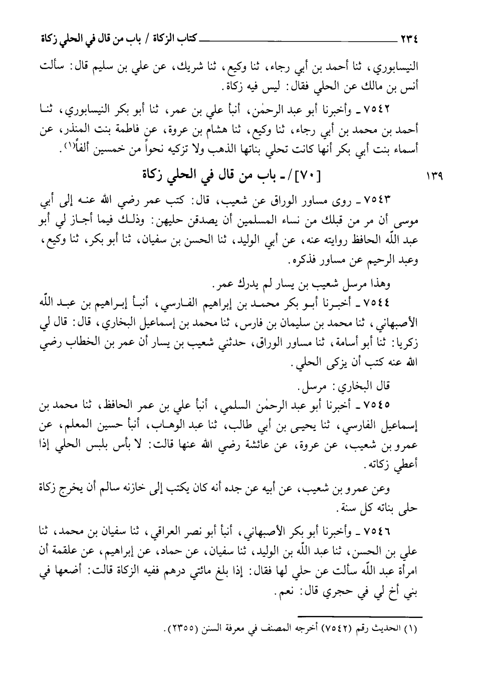 7544 - أَخْبَرَنَا أَبُو بَكْرٍ مُحَمَّدُ بْنُ إِبْرَاهِيمَ الْفَارِسِيُّ أنبأ إِبْرَاهِيمُ بْنُ عَبْدِ اللهِ الْأَصْبَهَانِيُّ، ثنا مُحَمَّدُ بْنُ سُلَيْمَانَ بْنِ فَارِسٍ، ثنا مُحَمَّدُ بْنُ إِسْمَاعِيلَ الْبُخَارِيُّ، قَالَ: قَالَ لِي زَكَرِيَّا: ثنا أَبُو أُسَامَةَ، ثنا مُسَاوِرٌ الْوَرَّاقُ، حَدَّثَنِي شُعَيْبُ بْنُ يَسَارٍ، أَنَّ عُمَرَ بْنَ الْخَطَّابِ رَضِيَ اللهُ عَنْهُ كَتَبَ أَنْ " §يُزَكَّى الْحُلِيُّ " قَالَ الْبُخَارِيُّ: مُرْسَلٌ