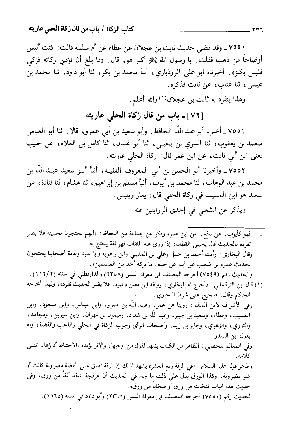 7550 - وَقَدْ مَضَى حَدِيثُ ثَابِتِ بْنِ عَجْلَانَ عَنْ عَطَاءٍ، عَنْ أُمِّ سَلَمَةَ قَالَتْ: كُنْتُ أَلْبَسُ أَوْضَاحًا مِنْ ذَهَبٍ فَقُلْتُ: يَا رَسُولَ اللهِ صَلَّى اللهُ عَلَيْهِ وَسَلَّمَ أَكَنْزٌ هُوَ؟ قَالَ: §" مَا بَلَغَ أَنْ تُؤَدِّيَ زَكَاتَهُ فَزُكِّيَ فَلَيْسَ بِكَنْزٍ ". أَخْبَرَنَاهُ أَبُو عَلِيٍّ الرُّوذْبَارِيُّ أنبأ مُحَمَّدُ بْنُ بَكْرٍ ثنا أَبُو دَاوُدَ , ثنا مُحَمَّدُ بْنُ عِيسَى , ثنا عَتَّابٌ عَنْ ثَابِتٍ فَذَكَرَهُ، وَهَذَا يَتَفَرَّدُ بِهِ ثَابِتُ بْنُ عَجْلَانَ وَاللهُ أَعْلَمُ