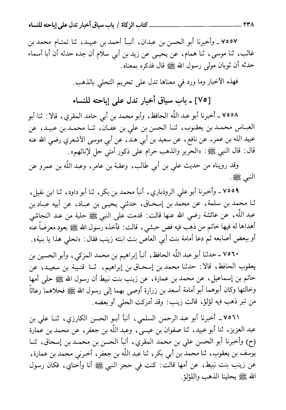 7561 - أَخْبَرَنَا أَبُو عَبْدِ الرَّحْمَنِ السُّلَمِيُّ، أنبأ أَبُو الْحَسَنِ الْكَارِزِيُّ، ثنا عَلِيُّ بْنُ عَبْدِ الْعَزِيزِ، ثنا أَبُو عُبَيْدٍ، ثنا صَفْوَانُ بْنُ عِيسَى، وَعَبْدُ اللهِ بْنُ جَعْفَرٍ، عَنْ مُحَمَّدِ بْنِ عُمَارَةَ، ح وَأَخْبَرَنَا أَبُو الْحَسَنِ عَلِيُّ بْنُ مُحَمَّدٍ الْمُقْرِئُ , أنبأ الْحَسَنُ بْنُ مُحَمَّدِ بْنِ إِسْحَاقَ، ثنا يُوسُفُ بْنُ يَعْقُوبَ، ثنا مُحَمَّدُ بْنُ أَبِي بَكْرٍ، ثنا عَبْدُ اللهِ بْنُ جَعْفَرٍ، أَخْبَرَنِي مُحَمَّدُ بْنُ عُمَارَةَ، عَنْ زَيْنَبَ بِنْتِ نُبَيْطٍ، عَنْ أُمِّهَا، قَالَتْ: " كُنْتُ فِي حِجْرِ النَّبِيِّ صَلَّى اللهُ عَلَيْهِ وَسَلَّمَ أَنَا وَأُخْتَايَ , فَكَانَ رَسُولُ اللهِ صَلَّى اللهُ عَلَيْهِ وَسَلَّمَ §يُحَلِّينَا الذَّهَبَ وَاللُّؤْلُؤَ ". -[239]- لَفْظُ حَدِيثِ مُحَمَّدِ بْنِ أَبِي بَكْرٍ , وَفِي رِوَايَةِ أَبِي عُبَيْدٍ فَكَانَ يُحَلِّينَا , قَالَ ابْنُ جَعْفَرٍ: رِعَاثًا مِنْ ذَهَبٍ وَلُؤْلُؤٍ , وَقَالَ صَفْوَانُ: يُحَلِّينَا التِّبْرَ وَاللُّؤْلُؤَ , قَالَ أَبُو عُبَيْدٍ قَالَ أَبُو عَمْرٍو: وَاحِدُ الرِّعَاثِ رَعَثَةٌ وَرَعْثَةٌ , وَهُوَ الْقُرْطُ فَهَذِهِ الْأَخْبَارُ وَمَا وَرَدَ فِي مَعْنَاهَا تَدُلُّ عَلَى إِبَاحَةِ التَّحَلِّي بِالذَّهَبِ لِلنِّسَاءِ , وَاسْتَدْلَلْنَا بِحُصُولِ الْإِجْمَاعِ عَلَى إِبَاحَتِهِ لَهُنَّ عَلَى نَسْخِ الْأَخْبَارِ الدَّالَّةِ عَلَى تَحْرِيمِهِ فِيهِنَّ خَاصَّةً وَاللهُ أَعْلَمُ