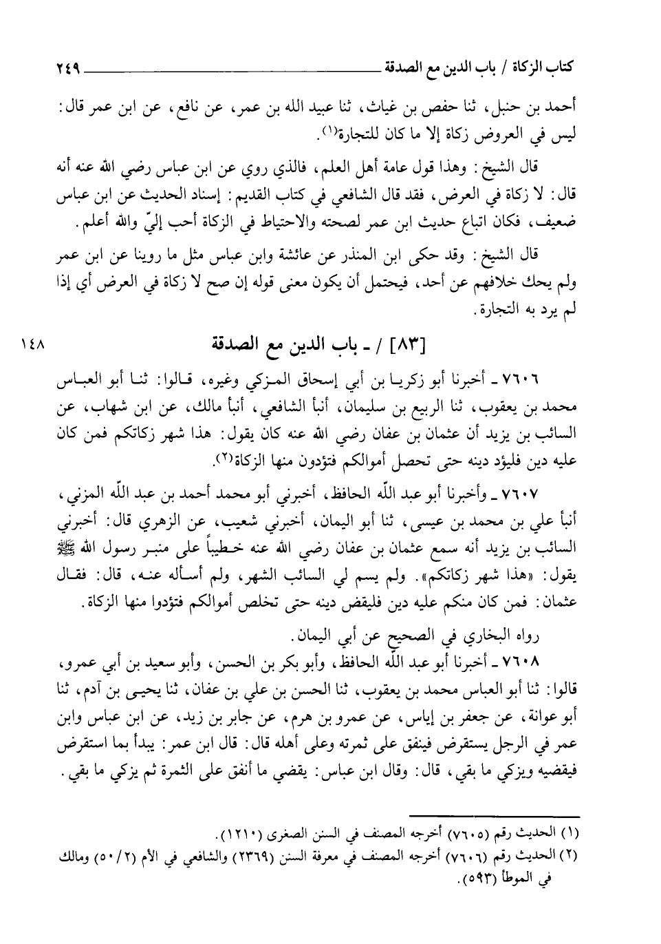 7606 - أَخْبَرَنَا أَبُو زَكَرِيَّا بْنُ أَبِي إِسْحَاقَ الْمُزَكِّي، وَغَيْرُهُ قَالُوا: ثنا أَبُو الْعَبَّاسِ مُحَمَّدُ بْنُ يَعْقُوبَ , ثنا الرَّبِيعُ بْنُ سُلَيْمَانَ، أنبأ الشَّافِعِيُّ، أنبأ مَالِكٌ، عَنِ ابْنِ شِهَابٍ، عَنِ السَّائِبِ بْنِ يَزِيدَ، أَنَّ عُثْمَانَ بْنَ عَفَّانَ رَضِيَ اللهُ عَنْهُ كَانَ يَقُولُ: §" هَذَا شَهْرُ زَكَاتِكُمْ فَمَنْ كَانَ عَلَيْهِ دَيْنٌ فَلْيُؤَدِّ دَيْنَهُ حَتَّى تُحَصَّلَ أَمْوَالُكُمْ فَتُؤَدُّونَ مِنْهَا الزَّكَاةَ "