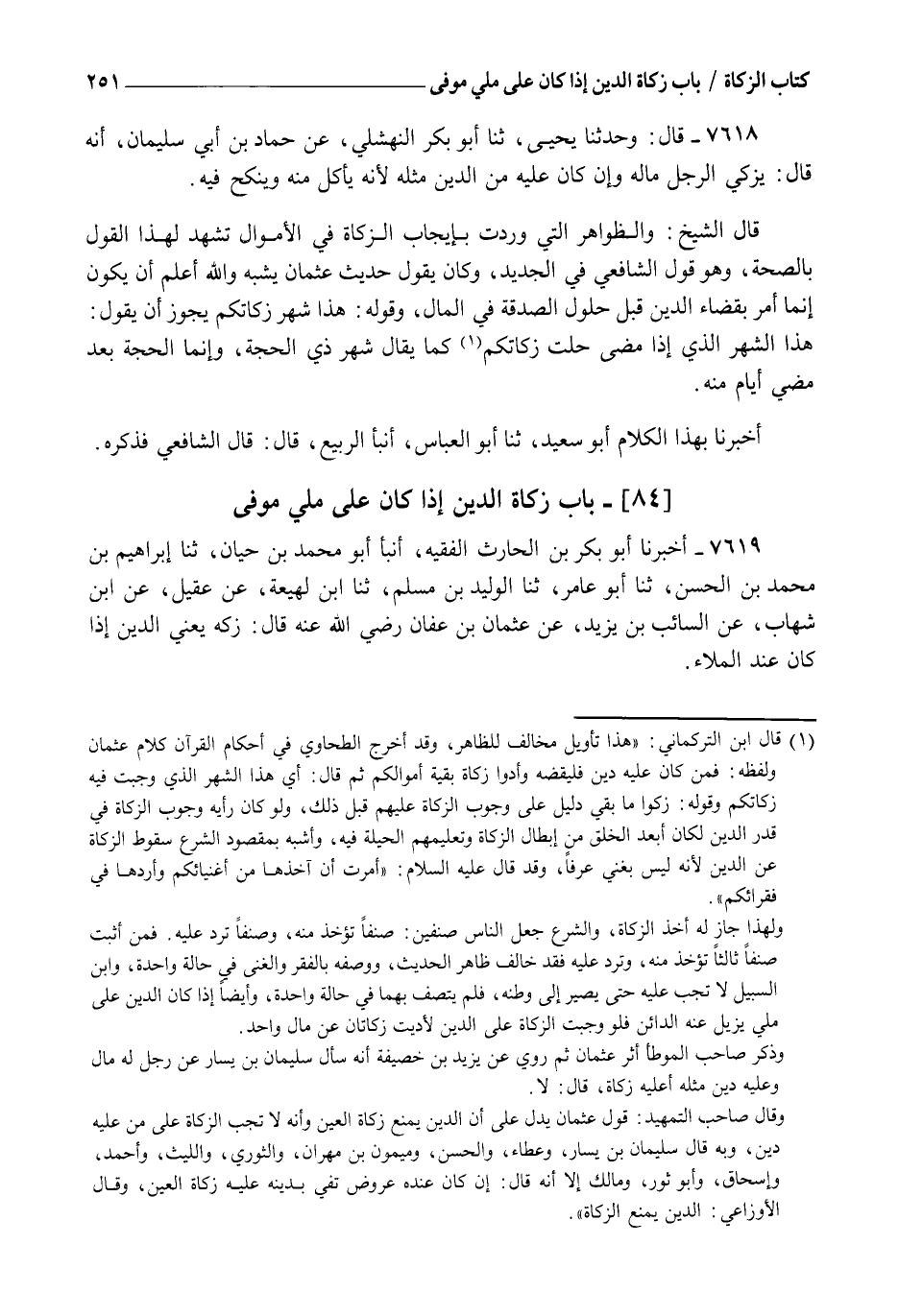 7618 - قَالَ: وَحَدَّثَنَا يَحْيَى، ثنا أَبُو بَكْرٍ النَّهْشَلِيُّ، عَنْ حَمَّادِ بْنِ أَبِي سُلَيْمَانَ أَنَّهُ قَالَ: §" يُزَكِّي الرَّجُلُ مَالَهُ وَإِنْ كَانَ عَلَيْهِ مِنَ الدَّيْنِ مِثْلُهُ؛ لَأَنَّهُ يَأْكُلُ مِنْهُ وَيَنْكِحُ فِيهِ ". قَالَ الشَّيْخُ: وَالظَّوَاهِرُ الَّتِي وَرَدَتْ بِإِيجَابِ الزَّكَاةِ فِي الْأَمْوَالِ تَشْهَدُ لِهَذَا الْقَوْلِ بِالصِّحَّةِ، وَهُوَ قَوْلُ الشَّافِعِيِّ فِي الْجَدِيدِ وَكَانَ يَقُولُ: حَدِيثُ عُثْمَانَ يُشْبِهُ وَاللهُ أَعْلَمُ أَنْ يَكُونَ إِنَّمَا أَمَرَ بِقَضَاءِ الدَّيْنِ قَبْلَ حُلُولِ الصَّدَقَةِ فِي الْمَالِ , وَقَوْلُهُ هَذَا شَهْرُ زَكَاتِكُمْ يَجُوزُ أَنْ يَقُولَ: هَذَا الشَّهْرُ الَّذِي إِذَا مَضَى حَلَّتْ زَكَاتُكُمْ كَمَا يُقَالُ شَهْرُ ذِي الْحِجَّةِ وَإِنَّمَا الْحِجَّةُ بَعْدَ مُضَيِّ أَيَّامٍ مِنْهُ. أَخْبَرَنَا بِهَذَا الْكَلَامِ أَبُو سَعِيدٍ , ثنا أَبُو الْعَبَّاسِ أَنْبَأَ الرَّبِيعُ قَالَ: قَالَ الشَّافِعِيُّ فَذَكَرَهُ