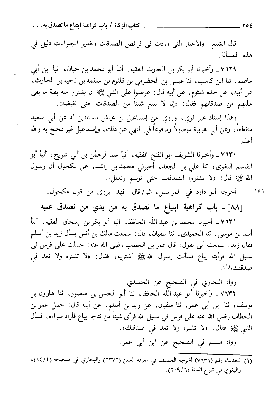 7631 - أَخْبَرَنَا مُحَمَّدُ بْنُ عَبْدِ اللهِ الْحَافِظُ، أنبأ أَبُو بَكْرِ بْنُ إِسْحَاقَ الْفَقِيهُ، أنبأ أَسَدُ بْنُ مُوسَى، ثنا الْحُمَيْدِيُّ، ثنا سُفْيَانُ، قَالَ: سَمِعْتُ مَالِكَ بْنَ أَنَسٍ، يَسْأَلُ زَيْدَ بْنَ أَسْلَمَ , فَقَالَ زَيْدٌ: سَمِعْتُ أَبِي يَقُولُ: قَالَ عُمَرُ بْنُ الْخَطَّابِ رَضِيَ اللهُ عَنْهُ: حَمَلْتُ عَلَى فَرَسٍ فِي سَبِيلِ اللهِ فَرَأَيْتُهُ يُبَاعُ , فَسَأَلْتُ رَسُولَ اللهِ صَلَّى اللهُ عَلَيْهِ وَسَلَّمَ أَشْتَرِيهِ فَقَالَ: §" لَا تَشْتَرِهِ وَلَا تَعُدْ فِي صَدَقَتِكَ ". رَوَاهُ الْبُخَارِيُّ فِي الصَّحِيحِ عَنِ الْحُمَيْدِيِّ