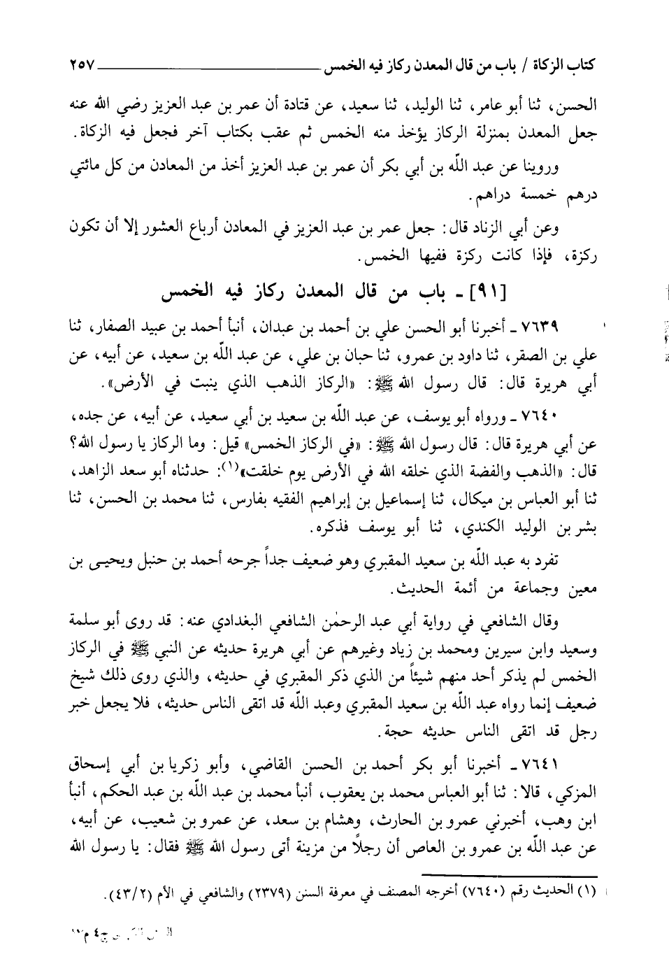 7640 - وَرَوَاهُ أَبُو يُوسُفَ عَنْ عَبْدِ اللهِ بْنِ سَعِيدِ بْنِ أَبِي سَعِيدٍ، عَنْ أَبِيهِ، عَنْ جَدِّهِ، عَنْ أَبِي هُرَيْرَةَ قَالَ: قَالَ رَسُولُ اللهِ صَلَّى اللهُ عَلَيْهِ وَسَلَّمَ: " §فِي الرِّكَازِ الْخُمُسُ " , قِيلَ: وَمَا الرِّكَازُ يَا رَسُولَ اللهِ؟ قَالَ: " الذَّهَبُ وَالْفِضَّةُ الَّذِي خَلَقَهُ اللهُ فِي الْأَرْضِ يَوْمَ خُلِقَتْ "، حَدَّثَنَاهُ أَبُو سَعْدٍ الزَّاهِدُ , ثنا أَبُو الْعَبَّاسِ بْنُ مِيكَالٍ , ثنا إِسْمَاعِيلُ بْنُ إِبْرَاهِيمَ الْفَقِيهُ بِفَارِسَ , ثنا مُحَمَّدُ بْنُ الْحَسَنِ , ثنا بِشْرُ بْنُ الْوَلِيدِ الْكِنْدِيُّ، ثنا أَبُو يُوسُفَ فَذَكَرَهُ، تَفَرَّدَ بِهِ عَبْدُ اللهِ بْنُ سَعِيدٍ الْمَقْبُرِيُّ وَهُوَ ضَعِيفٌ جِدًّا جَرَّحَهُ أَحْمَدُ بْنُ حَنْبَلٍ وَيَحْيَى بْنُ مَعِينٍ وَجَمَاعَةٌ مِنْ أَئِمَّةِ الْحَدِيثِ. وَقَالَ الشَّافِعِيُّ فِي رِوَايَةِ أَبِي عَبْدِ الرَّحْمَنِ الشَّافِعِيِّ الْبَغْدَادِيِّ عَنْهُ: قَدْ رَوَى أَبُو سَلَمَةَ وَسَعِيدٌ وَابْنُ سِيرِينَ وَمُحَمَّدُ بْنُ زِيَادٍ وَغَيْرُهُمْ عَنْ أَبِي هُرَيْرَةَ حَدِيثَهُ عَنِ النَّبِيِّ صَلَّى اللهُ عَلَيْهِ وَسَلَّمَ فِي الرِّكَازِ الْخُمُسُ لَمْ يَذْكُرَ أَحَدٌ مِنْهُمْ شَيْئًا مِنَ الَّذِي ذَكَرَ الْمَقْبُرِيُّ فِي حَدِيثِهِ وَالَّذِي رَوَى ذَلِكَ شَيْخٌ ضَعِيفٌ إِنَّمَا رَوَاهُ عَبْدُ اللهِ بْنُ سَعِيدٍ الْمَقْبُرِيُّ , وَعَبْدُ اللهِ قَدِ اتَّقَى النَّاسُ حَدِيثَهُ فَلَا يَجْعَلُ خَبَرَ رَجُلٍ قَدِ اتَّقَى النَّاسُ حَدِيثَهُ حُجَّةً