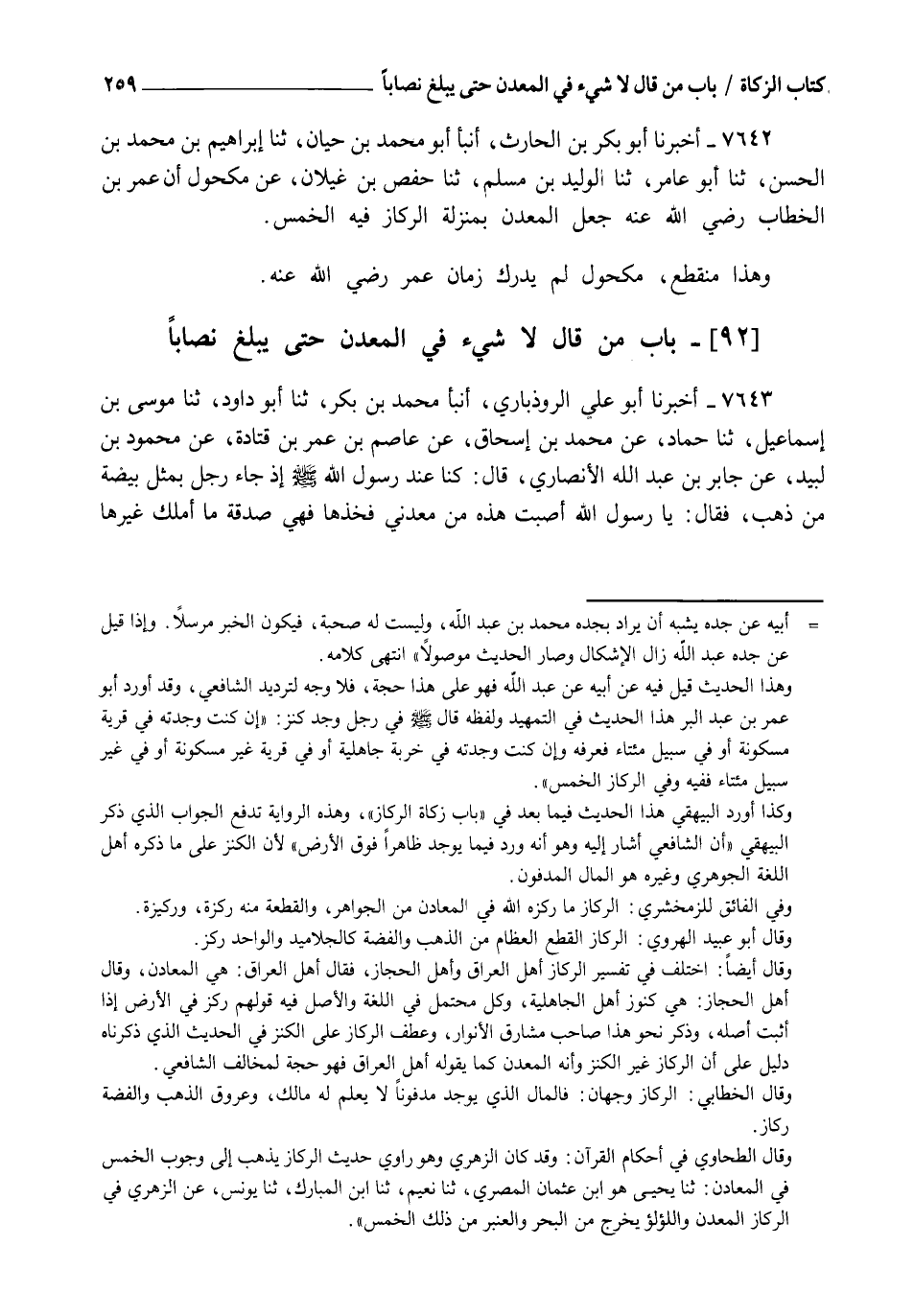 7642 - أَخْبَرَنَا أَبُو بَكْرِ بْنُ الْحَارِثِ، أنبأ أَبُو مُحَمَّدِ بْنُ حَيَّانَ، ثنا إِبْرَاهِيمُ بْنُ مُحَمَّدِ بْنِ الْحَسَنِ، ثنا أَبُو عَامِرٍ، ثنا الْوَلِيدُ بْنُ مُسْلِمٍ، ثنا حَفْصُ بْنُ غَيْلَانَ، عَنْ مَكْحُولٍ، أَنَّ عُمَرَ بْنَ الْخَطَّابِ رَضِيَ اللهُ عَنْهُ §جَعَلَ الْمَعْدِنَ بِمَنْزِلَةِ الرِّكَازِ فِيهِ الْخُمُسُ. وَهَذَا مُنْقَطِعٌ , مَكْحُولٌ لَمْ يُدْرِكْ زَمَانَ عُمَرَ رَضِيَ اللهُ عَنْهُ