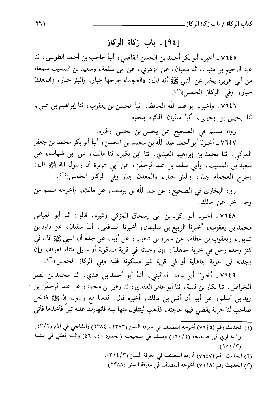 7645 - أَخْبَرَنَا أَبُو بَكْرٍ أَحْمَدُ بْنُ الْحَسَنِ الْقَاضِي , أنبأ حَاجِبُ بْنُ أَحْمَدَ الطُّوسِيُّ، ثنا عَبْدُ الرَّحِيمِ بْنُ مُنِيبٍ، ثنا سُفْيَانُ، عَنِ الزُّهْرِيِّ، عَنْ أَبِي سَلَمَةَ، وَسَعِيدِ بْنِ الْمُسَيِّبِ، سَمِعَاهُ مِنْ أَبِي هُرَيْرَةَ، يُخْبِرُ عَنِ النَّبِيِّ صَلَّى اللهُ عَلَيْهِ وَسَلَّمَ أَنَّهُ قَالَ: §" الْعَجْمَاءُ جَرْحُهَا جُبَارٌ وَالْبِئْرُ جُبَارٌ وَالْمَعْدِنُ جُبَارٌ وَفِي الرِّكَازِ الْخُمُسُ ".
