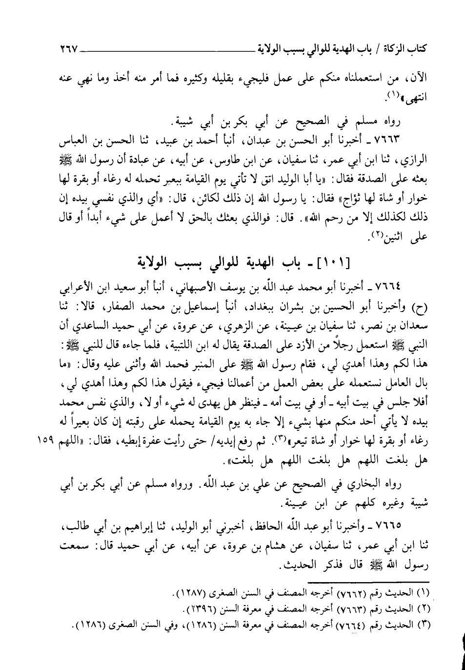 7664 - أَخْبَرَنَا أَبُو مُحَمَّدٍ عَبْدُ اللهِ بْنُ يُوسُفَ الْأَصْبَهَانِيُّ، أنبأ أَبُو سَعِيدِ بْنُ الْأَعْرَابِيِّ، ح وَأَخْبَرَنَا أَبُو الْحُسَيْنِ بْنُ بِشْرَانَ، بِبَغْدَادَ، أنبأ إِسْمَاعِيلُ بْنُ مُحَمَّدٍ الصَّفَّارُ، قَالَا: ثنا سَعْدَانُ بْنُ نَصْرٍ، ثنا سُفْيَانُ بْنُ عُيَيْنَةَ، عَنِ الزُّهْرِيِّ، عَنْ عُرْوَةَ، عَنْ أَبِي حُمَيْدٍ السَّاعِدِيِّ أَنَّ النَّبِيَّ صَلَّى اللهُ عَلَيْهِ وَسَلَّمَ اسْتَعْمَلَ رَجُلًا مِنَ الْأَزْدِ عَلَى الصَّدَقَةِ، يُقَالُ لَهُ ابْنُ اللُّتْبِيَّةِ فَلَمَّا جَاءَهُ، قَالَ لِلنَّبِيِّ صَلَّى اللهُ عَلَيْهِ وَسَلَّمَ: هَذَا لَكُمْ وَهَذَا أُهْدِيَ لِي، فَقَامَ رَسُولُ اللهِ صَلَّى اللهُ عَلَيْهِ وَسَلَّمَ عَلَى الْمِنْبَرِ فَحَمِدَ اللهَ وَأَثْنَى عَلَيْهِ، وَقَالَ: §" مَا بَالُ الْعَامِلِ نَسْتَعْمِلُهُ عَلَى بَعْضِ الْعَمَلِ مِنْ أَعْمَالِنَا فَيَجِيءُ فَيَقُولُ هَذَا لَكُمْ وَهَذَا أُهْدِيَ لِي، أَفَلَا جَلَسَ فِي بَيْتِ أَبِيهِ أَوْ فِي بَيْتِ أُمِّهِ فَيَنْظُرَ هَلْ يُهْدَى لَهُ شَيْءٌ أَوْ لَا، وَالَّذِي نَفْسُ مُحَمَّدٍ بِيَدِهِ لَا يَأْتِي أَحَدٌ مِنْكُمْ مِنْهَا بِشَيْءٍ إِلَّا جَاءَ بِهِ يَوْمَ الْقِيَامَةِ يَحْمِلُهُ عَلَى رَقَبَتِهِ إِنْ كَانَ بَعِيرًا لَهُ رُغَاءٌ، أَوْ بَقَرَةٌ لَهَا خُوَارٌ، أَوْ شَاةٌ تَيْعَرُ ". ثُمَّ رَفَعَ يَدَيْهِ حَتَّى رَأَيْتُ عُفْرَةَ إِبْطَيْهِ، فَقَالَ: " اللهُمَّ هَلْ بَلَّغْتُ اللهُمَّ هَلْ بَلَّغْتُ اللهُمَّ هَلْ بَلَّغْتُ ". رَوَاهُ الْبُخَارِيُّ فِي الصَّحِيحِ عَنْ عَلِيِّ بْنِ عَبْدِ اللهِ. وَرَوَاهُ مُسْلِمٌ عَنْ أَبِي بَكْرِ بْنِ أَبِي شَيْبَةَ وَغَيْرِهِ، كُلُّهُمْ عَنِ ابْنِ عُيَيْنَةَ.