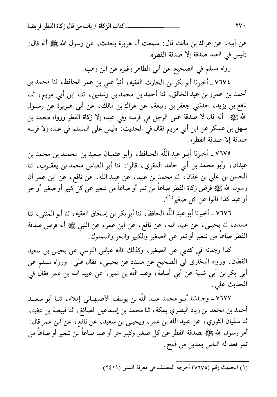 7676 - أَخْبَرَنَا أَبُو عَبْدِ اللهِ الْحَافِظُ، ثنا أَبُو بَكْرِ بْنُ إِسْحَاقَ الْفَقِيهُ، ثنا أَبُو الْمُثَنَّى، ثنا مُسَدَّدٌ، ثنا يَحْيَى، عَنْ عُبَيْدِ اللهِ، عَنْ نَافِعٍ، عَنِ ابْنِ عُمَرَ، عَنِ النَّبِيِّ صَلَّى اللهُ عَلَيْهِ وَسَلَّمَ أَنَّهُ §" فَرَضَ صَدَقَةَ الْفِطْرِ صَاعًا مِنْ شَعِيرٍ أَوْ تَمْرٍ عَنِ الصَّغِيرِ وَالْكَبِيرِ، وَالْحُرِّ وَالْمَمْلُوكِ ". كَذَا وَجَدْتُهُ فِي كِتَابِي عَنِ الصَّغِيرِ، وَكَذَلِكَ قَالَهُ عَبَّاسٌ النَّرْسِيُّ عَنْ يَحْيَى بْنِ سَعِيدٍ الْقَطَّانِ وَرَوَاهُ الْبُخَارِيُّ فِي الصَّحِيحِ عَنْ مُسَدَّدٍ عَنْ يَحْيَى، فَقَالَ عَلِيٌّ: وَرَوَاهُ مُسْلِمٌ عَنْ أَبِي بَكْرِ بْنِ أَبِي شَيْبَةَ عَنْ أَبِي أُسَامَةَ وَعَبْدِ اللهِ بْنِ نُمَيْرٍ عَنْ عُبَيْدِ اللهِ بْنِ عُمَرَ فَقَالَ فِي الْحَدِيثِ عَلِيٌّ