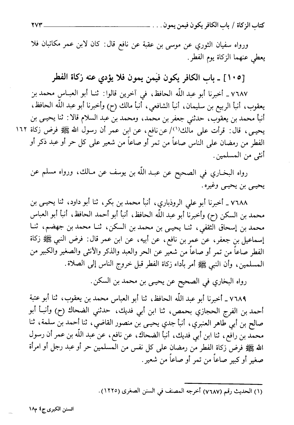 7688 - أَخْبَرَنَا أَبُو عَلِيٍّ الرُّوذْبَارِيُّ، أنبأ مُحَمَّدُ بْنُ بَكْرٍ، ثنا أَبُو دَاوُدَ، ثنا يَحْيَى بْنُ مُحَمَّدِ بْنِ السَّكَنِ، ح وَأَخْبَرَنَا أَبُو عَبْدِ اللهِ الْحَافِظُ، أنبأ أَبُو أَحْمَدَ الْحَافِظُ، أنبأ أَبُو الْعَبَّاسِ مُحَمَّدُ بْنُ إِسْحَاقَ الثَّقَفِيُّ، ثنا يَحْيَى بْنُ مُحَمَّدِ بْنِ السَّكَنِ، ثنا مُحَمَّدُ بْنُ جَهْضَمٍ، ثنا إِسْمَاعِيلُ بْنُ جَعْفَرٍ، عَنْ عُمَرَ بْنِ نَافِعٍ، عَنْ أَبِيهِ، عَنِ ابْنِ عُمَرَ قَالَ: §" فَرَضَ النَّبِيُّ صَلَّى اللهُ عَلَيْهِ وَسَلَّمَ زَكَاةَ الْفِطْرِ صَاعًا مِنْ تَمْرٍ أَوْ صَاعًا مِنْ شَعِيرٍ عَنِ الْحُرِّ وَالْعَبْدِ وَالذَّكَرِ وَالْأُنْثَى وَالصَّغِيرِ وَالْكَبِيرِ مِنَ الْمُسْلِمِينَ، وَأَنَّ النَّبِيَّ صَلَّى اللهُ عَلَيْهِ وَسَلَّمَ أَمَرَ بِأَدَاءِ زَكَاةِ الْفِطْرِ قَبْلَ خُرُوجِ النَّاسِ إِلَى الصَّلَاةِ " رَوَاهُ الْبُخَارِيُّ فِي الصَّحِيحِ عَنْ يَحْيَى بْنِ مُحَمَّدِ بْنِ السَّكَنِ