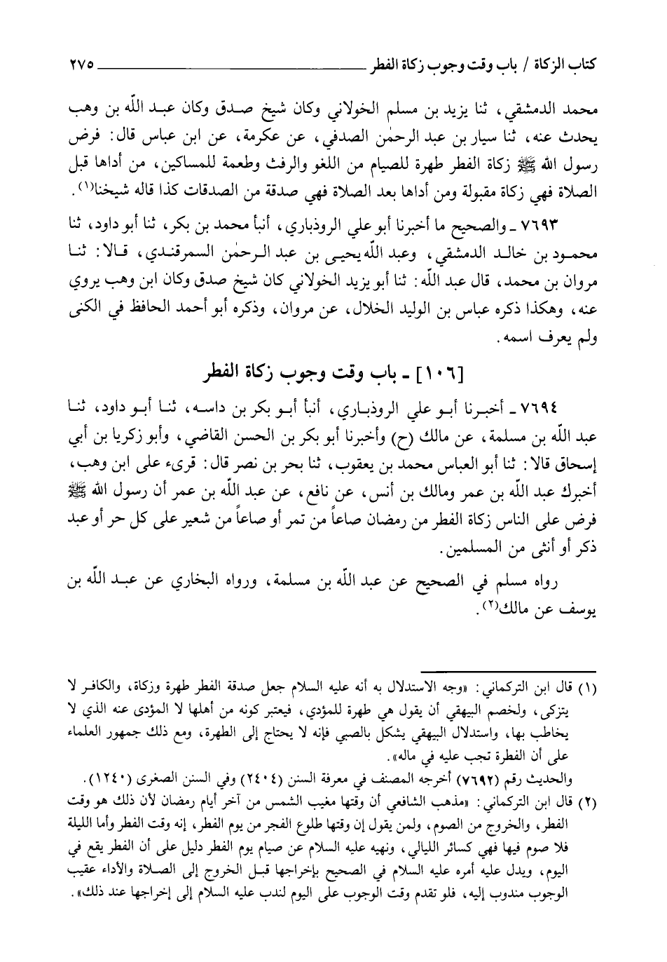 7694 - أَخْبَرَنَا أَبُو عَلِيٍّ الرُّوذْبَارِيُّ، أنبأ أَبُو بَكْرِ بْنُ دَاسَةَ، ثنا أَبُو دَاوُدَ، ثنا عَبْدُ اللهِ بْنُ مَسْلَمَةَ، عَنْ مَالِكٍ، ح وَأَخْبَرَنَا أَبُو بَكْرِ بْنُ الْحَسَنِ الْقَاضِي، وَأَبُو زَكَرِيَّا بْنُ أَبِي إِسْحَاقَ، قَالَا: ثنا أَبُو الْعَبَّاسِ مُحَمَّدُ بْنُ يَعْقُوبَ، ثنا بَحْرُ بْنُ نَصْرٍ، قَالَ: قُرِئَ عَلَى ابْنِ وَهْبٍ، أَخْبَرَكَ عَبْدُ اللهِ بْنُ عُمَرَ، وَمَالِكُ بْنُ أَنَسٍ، عَنْ نَافِعٍ، عَنْ عَبْدِ اللهِ بْنِ عُمَرَ أَنَّ رَسُولَ اللهِ صَلَّى اللهُ عَلَيْهِ وَسَلَّمَ، §فَرَضَ عَلَى النَّاسِ زَكَاةَ الْفِطْرِ مِنْ رَمَضَانَ صَاعًا مِنْ تَمْرٍ أَوْ صَاعًا مِنْ شَعِيرٍ، عَلَى كُلِّ حُرٍّ، أَوْ عَبْدٍ ذَكَرٍ، أَوْ أُنْثَى مِنَ الْمُسْلِمِينَ. رَوَاهُ مُسْلِمٌ فِي الصَّحِيحِ عَنْ عَبْدِ اللهِ بْنِ مَسْلَمَةَ، وَرَوَاهُ الْبُخَارِيُّ عَنْ عَبْدِ اللهِ بْنِ يُوسُفَ عَنْ مَالِكٍ
