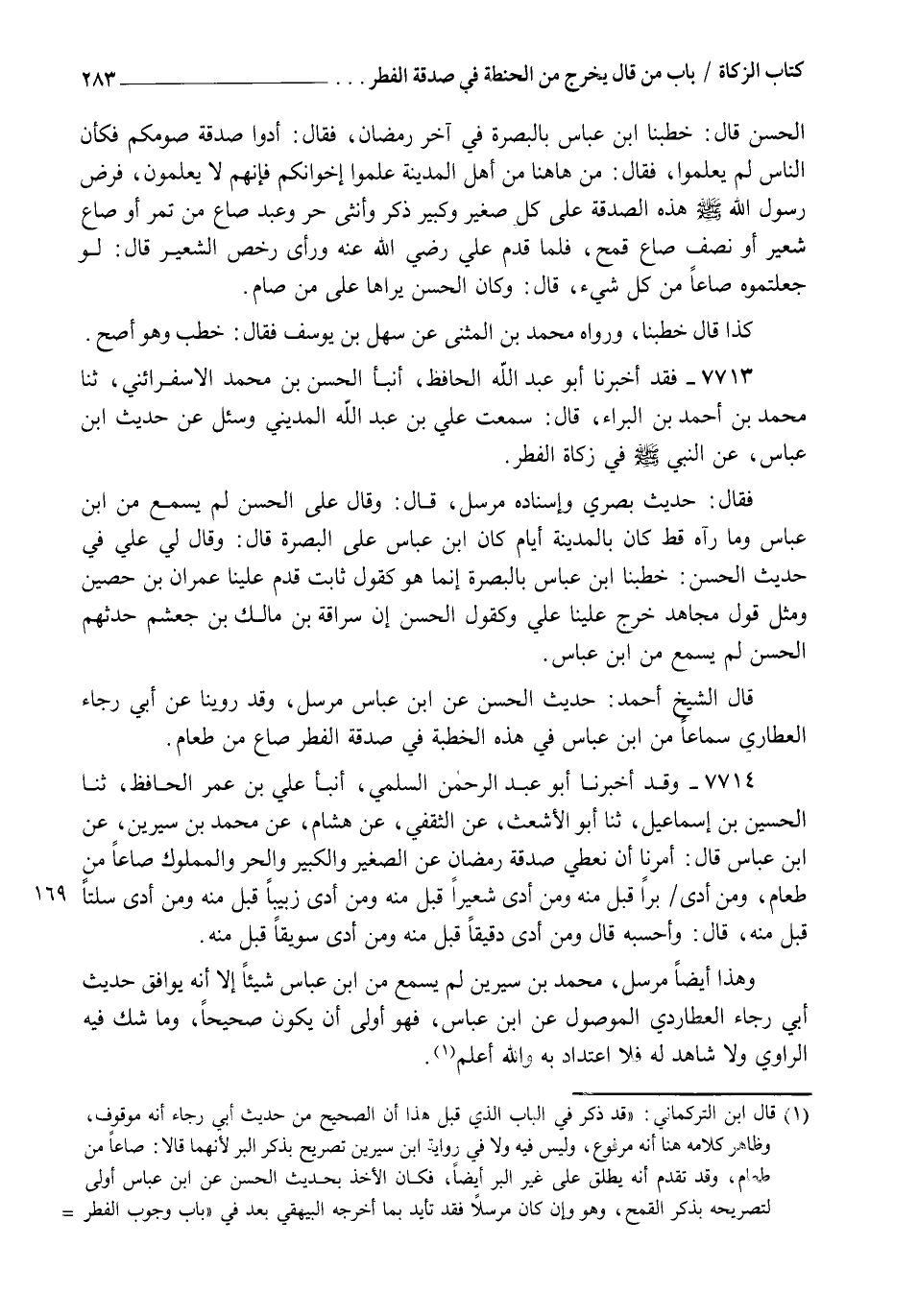 7714 - وَقَدْ أَخْبَرَنَا أَبُو عَبْدِ الرَّحْمَنِ السُّلَمِيُّ، أنبأ عَلِيُّ بْنُ عُمَرَ الْحَافِظُ، ثنا الْحُسَيْنُ بْنُ إِسْمَاعِيلَ، ثنا أَبُو الْأَشْعَثِ، عَنِ الثَّقَفِيِّ، عَنْ هِشَامٍ، عَنْ مُحَمَّدِ بْنِ سِيرِينَ، عَنِ ابْنِ عَبَّاسٍ قَالَ: §" أُمِرْنَا أَنْ نُعْطِيَ صَدَقَةَ رَمَضَانَ عَنِ الصَّغِيرِ وَالْكَبِيرِ وَالْحُرِّ وَالْمَمْلُوكِ صَاعًا مِنْ طَعَامٍ، وَمَنْ أَدَّى بُرًّا قُبِلَ مِنْهُ وَمَنْ أَدَّى شَعِيرًا قُبِلَ مِنْهُ وَمَنْ أَدَّى زَبِيبًا قُبِلَ مِنْهُ وَمَنْ أَدَّى سلْتًا قُبِلَ مِنْهُ ". قَالَ: وَأَحْسِبُهُ قَالَ: وَمَنْ أَدَّى دَقِيقًا قُبِلَ مِنْهُ وَمَنْ أَدَّى سَوِيقًا قُبِلَ مِنْهُ. وَهَذَا أَيْضًا مُرْسَلٌ، مُحَمَّدُ بْنُ سِيرِينَ لَمْ يَسْمَعْ مِنَ ابْنِ عَبَّاسٍ شَيْئًا إِلَّا أَنَّهُ يُوَافِقُ حَدِيثَ أَبِي رَجَاءٍ الْعُطَارِدِيُّ الْمَوْصُولَ عَنِ ابْنِ عَبَّاسٍ فَهُوَ أَوْلَى أَنْ يَكُونَ صَحِيحًا وَمَا شَكَّ فِيهِ الرَّاوِي وَلَا شَاهِدَ لَهُ، فَلَا اعْتِدَادَ بِهِ. وَاللهُ أَعْلَمُ