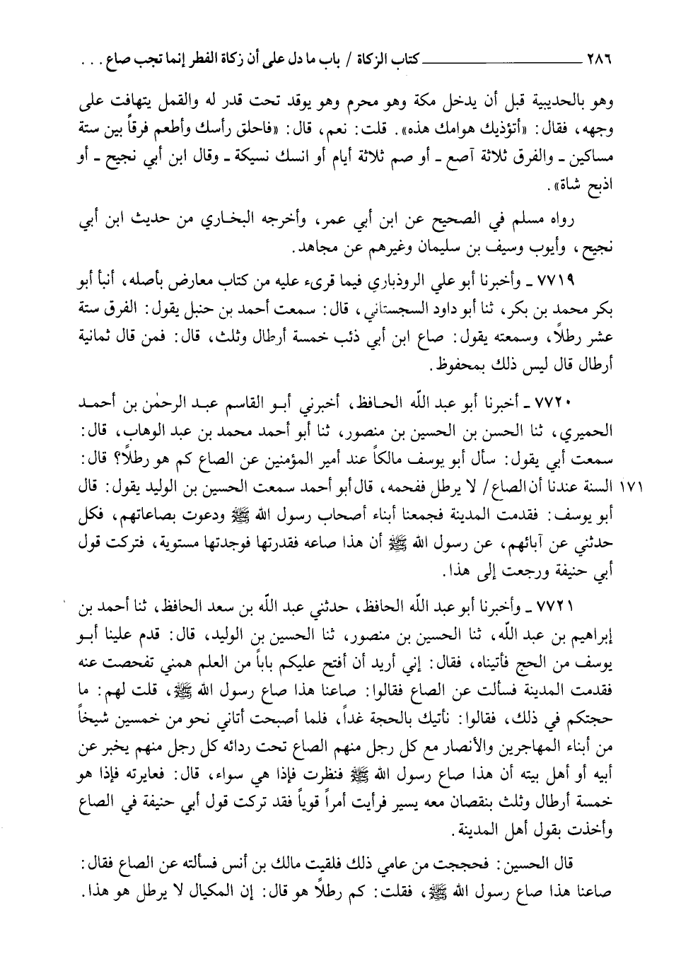 7721 - وَأَخْبَرَنَا أَبُو عَبْدِ اللهِ الْحَافِظُ، حدَّثَنِي عَبْدُ اللهِ بْنُ سَعْدٍ الْحَافِظُ، ثنا أَحْمَدُ بْنُ إِبْرَاهِيمَ بْنِ عَبْدِ اللهِ، ثنا الْحُسَيْنُ بْنُ مَنْصُورٍ، ثنا الْحُسَيْنُ بْنُ الْوَلِيدِ، قَالَ: قَدِمَ عَلَيْنَا أَبُو يُوسُفَ مِنَ الْحَجِّ، فَأَتَيْنَاهُ، فَقَالَ: " إِنِّي أُرِيدُ أَنْ أَفْتَحَ عَلَيْكُمْ بَابًا مِنَ الْعِلْمِ هَمَّنِي، تَفَحَّصْتُ عَنْهُ فَقَدِمْتُ الْمَدِينَةَ فَسَأَلْتُ عَنِ الصَّاعِ، فَقَالُوا: §صَاعُنَا هَذَا صَاعُ رَسُولِ اللهِ صَلَّى اللهُ عَلَيْهِ وَسَلَّمَ، قُلْتُ لَهُمْ: مَا حُجَّتُكُمْ فِي ذَلِكَ؟ فَقَالُوا: نَأْتِيكَ بِالْحُجَّةِ غَدًا، فَلَمَّا أَصْبَحْتُ أَتَانِي نَحْوٌ مِنْ خَمْسِينَ شَيْخًا مِنْ أَبْنَاءِ الْمُهَاجِرِينَ وَالْأَنْصَارِ، مَعَ كُلِّ رَجُلٍ مِنْهُمُ الصَّاعُ تَحْتَ رِدَائِهِ، كُلُّ رَجُلٍ مِنْهُمْ يُخْبِرُ عَنْ أَبِيهِ أَوْ أَهْلِ بَيْتِهِ أَنَّ هَذَا صَاعُ رَسُولِ اللهِ صَلَّى اللهُ عَلَيْهِ وَسَلَّمَ فَنَظَرْتُ فَإِذَا هِيَ سَوَاءٌ، قَالَ: فَعَايَرْتُهُ فَإِذَا هُوَ خَمْسَةُ أَرْطَالٍ وَثُلُثٌ بِنُقْصَانٍ مَعَهُ يَسِيرٍ، فَرَأَيْتُ أَمْرًا قَوِيًّا فَقَدْ تَرَكْتُ قَوْلَ أَبِي حَنِيفَةَ فِي الصَّاعِ، وَأَخَذْتُ بِقَوْلِ أَهْلِ الْمَدِينَةِ " قَالَ الْحُسَيْنُ: فَحَجَجْتُ مِنْ عَامِي ذَلِكَ فَلَقِيتُ مَالِكَ بْنَ أَنَسٍ، فَسَأَلْتُهُ عَنِ الصَّاعِ، فَقَالَ: صَاعُنَا هَذَا صَاعُ رَسُولِ اللهِ صَلَّى اللهُ عَلَيْهِ وَسَلَّمَ، فَقُلْتُ: كَمْ رِطْلًا هُوَ؟ قَالَ: إِنَّ الْمِكْيَالَ لَا يُرْطَلُ، هُوَ هَذَا. -[287]- قَالَ الْحُسَيْنُ: فَلَقِيتُ عَبْدَ اللهِ بْنَ زَيْدِ بْنِ أَسْلَمَ، فَقَالَ: حَدَّثَنِي أَبِي عَنْ جَدِّي أَنَّ هَذَا صَاعُ عُمَرَ رَضِيَ اللهُ عَنْهُ