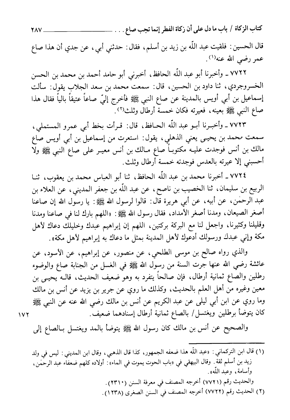7722 - وَأَخْبَرَنَا أَبُو عَبْدِ اللهِ الْحَافِظُ، أَخْبَرَنِي أَبُو حَامِدٍ أَحْمَدُ بْنُ مُحَمَّدِ بْنِ الْحَسَنِ الْخُسْرَوَجُرْدِيُّ، ثنا دَاوُدُ بْنُ الْحُسَيْنِ، قَالَ: سَمِعْتُ مُحَمَّدَ بْنَ سَعْدٍ الْجَلَّابُ، يَقُولُ: سَأَلْتُ إِسْمَاعِيلَ بْنَ أَبِي أُوَيْسٍ بِالْمَدِينَةِ، عَنْ صَاعِ النَّبِيِّ، صَلَّى اللهُ عَلَيْهِ وَسَلَّمَ " §فَأَخْرَجَ إِلَيَّ صَاعًا عَتِيقًا بَالِيًا، فَقَالَ: هَذَا صَاعُ النَّبِيِّ صَلَّى اللهُ عَلَيْهِ وَسَلَّمَ بِعَيْنِهِ فَعَيَّرْتُهُ فَكَانَ خَمْسَةَ أَرْطَالٍ وَثُلُثًا "