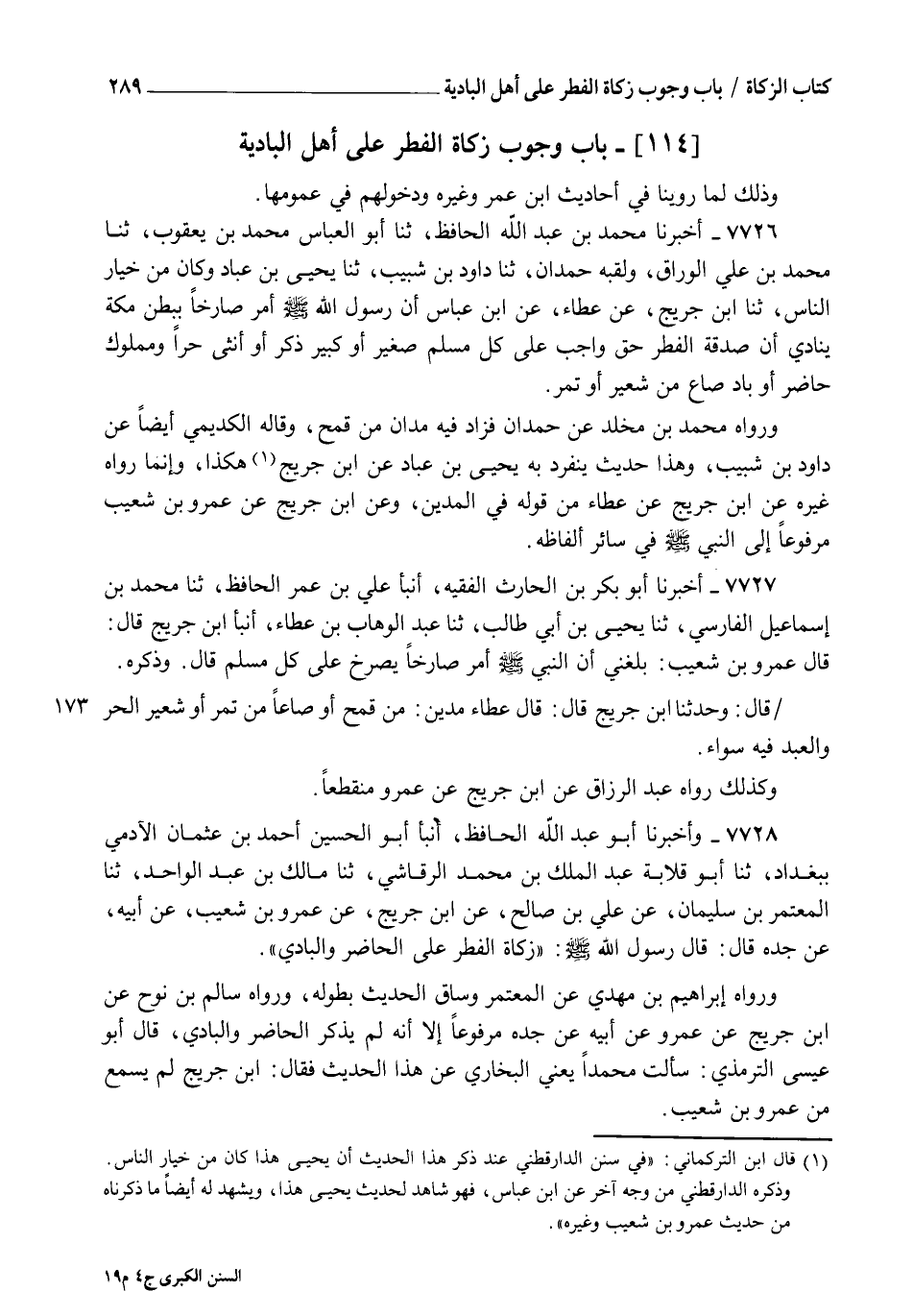 7726 - أَخْبَرَنَا مُحَمَّدُ بْنُ عَبْدِ اللهِ الْحَافِظُ، ثنا أَبُو الْعَبَّاسِ مُحَمَّدُ بْنُ يَعْقُوبَ، ثنا مُحَمَّدُ بْنُ عَلِيٍّ الْوَرَّاقُ وَلَقَبُهُ حَمْدَانُ، ثنا دَاوُدُ بْنُ شَبِيبٍ، ثنا يَحْيَى بْنُ عَبَّادٍ، وَكَانَ مِنْ خِيَارِ النَّاسِ، ثنا ابْنُ جُرَيْجٍ، عَنْ عَطَاءٍ، عَنِ ابْنِ عَبَّاسٍ، أَنَّ رَسُولَ اللهِ صَلَّى اللهُ عَلَيْهِ وَسَلَّمَ أَمَرَ صَارِخًا بِبَطْنِ مَكَّةَ يُنَادِي أَنَّ §صَدَقَةَ الْفِطْرِ حَقٌّ وَاجِبٌ عَلَى كُلِّ مُسْلِمٍ صَغِيرٍ أَوْ كَبِيرٍ ذَكَرٍ أَوْ أُنْثَى حُرٍّ وَمَمْلُوكٍ حَاضِرٍ أَوْ بَادٍ، صَاعٌ مِنْ شَعِيرٍ أَوْ تَمْرٍ. وَرَوَاهُ مُحَمَّدُ بْنُ مَخْلَدٍ عَنْ حَمْدَانَ فَزَادَ فِيهِ مُدَّانِ مِنْ قَمْحٍ، وَقَالَهُ الْكُدَيْمِيُّ أَيْضًا، عَنْ دَاوُدَ بْنِ شَبِيبٍ، وَهَذَا حَدِيثٌ يَنْفَرِدُ بِهِ يَحْيَى بْنُ عَبَّادٍ، عَنِ ابْنِ جُرَيْجٍ هَكَذَا، وَإِنَّمَا رَوَاهُ غَيْرُهُ عَنِ ابْنِ جُرَيْجٍ عَنْ عَطَاءٍ مِنْ قَوْلِهِ فِي الْمُدَّيْنِ، وَعَنِ ابْنِ جُرَيْجٍ، عَنْ عُمَرِو بْنِ شُعَيْبٍ مَرْفُوعًا إِلَى النَّبِيِّ صَلَّى اللهُ عَلَيْهِ وَسَلَّمَ فِي سَائِرِ ألْفَاظِهِ