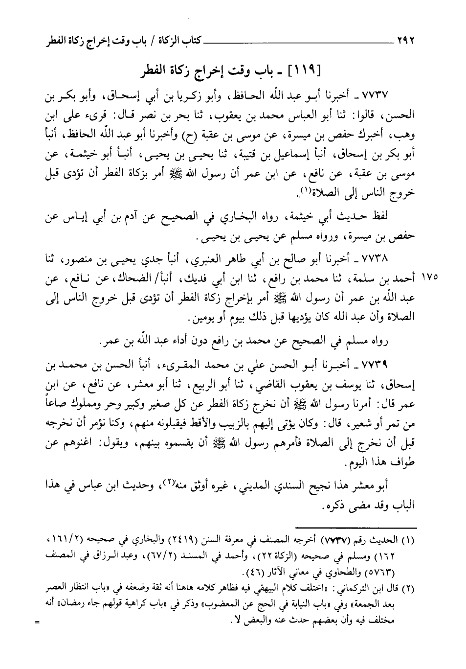 7737 - أَخْبَرَنَا أَبُو عَبْدِ اللهِ الْحَافِظُ، وَأَبُو زَكَرِيَّا بْنُ أَبِي إِسْحَاقَ , وَأَبُو بَكْرِ بْنُ الْحَسَنِ قَالُوا: ثنا أَبُو الْعَبَّاسِ مُحَمَّدُ بْنُ يَعْقُوبَ، ثنا بَحْرُ بْنُ نَصْرٍ، قَالَ: قُرِئَ عَلَى ابْنِ وَهْبٍ أَخْبَرَكَ حَفْصُ بْنُ مَيْسَرَةَ، عَنْ مُوسَى بْنِ عُقْبَةَ، ح وَأَخْبَرَنَا أَبُو عَبْدِ اللهِ الْحَافِظُ، أنبأ أَبُو بَكْرِ بْنُ إِسْحَاقَ، أنبأ إِسْمَاعِيلُ بْنُ قُتَيْبَةَ، ثنا يَحْيَى بْنُ يَحْيَى، أنبأ أَبُو خَيْثَمَةَ، عَنْ مُوسَى بْنِ عُقْبَةَ، عَنْ نَافِعٍ، عَنِ ابْنِ عُمَرَ، أَنَّ رَسُولَ اللهِ صَلَّى اللهُ عَلَيْهِ وَسَلَّمَ §أَمَرَ بِزَكَاةِ الْفِطْرِ أَنْ تُؤَدَّى قَبْلَ خُرُوجِ النَّاسِ إِلَى الصَّلَاةِ. لَفْظُ حَدِيثِ أَبِي خَيْثَمَةَ رَوَاهُ الْبُخَارِيُّ فِي الصَّحِيحِ، عَنْ آدَمَ بْنِ أَبِي إِيَاسٍ، عَنْ حَفْصِ بْنِ مَيْسَرَةَ، وَرَوَاهُ مُسْلِمٌ، عَنْ يَحْيَى بْنِ يَحْيَى