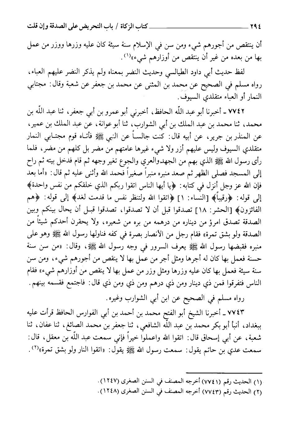 7742 - أَخْبَرَنَا أَبُو عَبْدِ اللهِ الْحَافِظُ، أَخْبَرَنِي أَبُو عَمْرِو بْنُ أَبِي جَعْفَرٍ، ثنا عَبْدُ اللهِ بْنُ مُحَمَّدٍ، ثنا مُحَمَّدُ بْنُ عَبْدِ الْمَلِكِ بْنِ أَبِي الشَّوَارِبِ، ثنا أَبُو عَوَانَةَ، عَنْ عَبْدِ الْمَلِكِ بْنِ عُمَيْرٍ، عَنِ الْمُنْذِرِ بْنِ جَرِيرٍ، عَنْ أَبِيهِ، قَالَ: كُنْتُ جَالِسًا عَندَ النَّبِيِّ صَلَّى اللهُ عَلَيْهِ وَسَلَّمَ، فَأَتَاهُ قَوْمٌ مُجْتَابِي النِّمَارِ مُتَقَلِّدِي السُّيُوفِ وَلَيْسَ عَلَيْهِمْ آزُرٌ وَلَا شَيْءَ غَيْرَهَا، عَامَّتُهُمْ مِنْ مُضَرَ، بَلْ كُلُّهُمْ مِنْ مُضَرَ، فَلَمَّا رَأَى رَسُولُ اللهِ صَلَّى اللهُ عَلَيْهِ وَسَلَّمَ الَّذِي بِهِمْ مِنَ الْجَهْدِ وَالْعُرَى وَالْجُوعِ تَغَيَّرَ وَجْهُهُ، ثُمَّ قَامَ فَدَخَلَ بَيْتَهُ ثُمَّ رَاحَ إِلَى الْمَسْجِدِ فَصَلَّى الظُّهْرَ ثُمَّ صَعِدَ مِنْبَرَهُ مِنْبَرًا صَغِيرًا، فَحَمِدَ اللهَ وَأَثْنَى عَلَيْهِ، ثُمَّ قَالَ: " أَمَّا بَعْدُ فَإِنَّ اللهَ عَزَّ وَجَلَّ أَنْزَلَ فِي كِتَابِهِ: {يَا أَيُّهَا النَّاسُ اتَّقُوا رَبَّكُمُ الَّذِي خَلَقَكُمْ مِنْ نَفْسٍ وَاحِدَةٍ} [النساء: 1] إِلَى قَوْلِهِ: {رَقِيبًا} [النساء: 1] {اتَّقُوا اللهَ وَلْتَنْظُرْ نَفْسٌ مَّا قَدَّمَتْ لِغَدٍ} [الحشر: 18] إِلَى قَوْلِهِ: {هُمُ الْفَائِزُونَ} [الحشر: 20] §تَصَدَّقُوا قَبَلَ أَنْ لَا تَصَدَّقُوا، تَصَدَّقُوا قَبَلَ أَنْ يُحَالَ بَيْنَكُمْ وَبَيْنَ الصَّدَقَةِ، تَصَدَّقَ امْرُؤٌ مِنْ دِينَارِهِ، مِنْ دِرْهَمِهِ، مِنْ بُرِّهِ، مِنْ شَعِيرِهِ، وَلَا يَحْقِرَنَّ أَحَدُكُمْ شَيْئًا مِنَ الصَّدَقَةِ وَلَوْ بِشِقِّ تَمْرَةٍ ". فَقَامَ رَجُلٌ مِنَ الْأَنْصَارِ بِصُرَّةٍ فِي كَفِّهِ، فَنَاوَلَهَا رَسُولَ اللهِ صَلَّى اللهُ عَلَيْهِ وَسَلَّمَ، وَهُوَ عَلَى مِنْبَرِهِ، فَقَبَضَهَا رَسُولُ اللهِ صَلَّى اللهُ عَلَيْهِ وَسَلَّمَ يُعْرَفُ السُّرُورُ فِي وَجْهِ رَسُولِ اللهِ صَلَّى اللهُ عَلَيْهِ وَسَلَّمَ، وَقَالَ: " مَنْ سَنَّ سُنَّةً حَسَنَةً فَعَمِلَ بِهَا كَانَ لَهُ أَجْرُهَا وَمِثْلُ أَجْرِ مَنْ عَمِلَ بِهَا لَا يَنْقُصُ مِنْ أُجُورِهِمْ شَيْءٌ , وَمَنْ سَنَّ سُنَّةً سَيِّئَةً فَعَمِلَ بِهَا كَانَ عَلَيْهِ وِزْرُهَا وَمِثْلُ وِزْرِ مَنْ عَمِلَ بِهَا لَا يَنْقُصُ مِنْ أَوْزَارِهِمْ شَيْءٌ ". فَقَامَ النَّاسُ فَتَفَرَّقُوا فَمِنْ ذِي دِينَارٍ، وَمِنْ ذِي دِرْهَمٍ، وَمِنْ ذِي وَمِنْ ذِي، قَالَ: فَاجْتَمَعَ فَقَسَمَهُ بَيْنَهُمْ. رَوَاهُ مُسْلِمٌ فِي الصَّحِيحِ عَنِ ابْنِ أَبِي الشَّوَارِبِ وَغَيْرِهِ