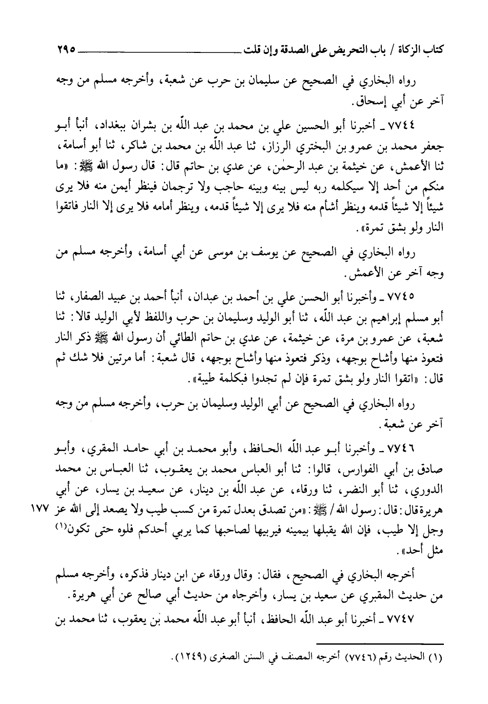 7745 - وَأَخْبَرَنَا أَبُو الْحَسَنِ عَلِيُّ بْنُ أَحْمَدَ بْنِ عَبْدَانَ، أنبأ أَحْمَدُ بْنُ عُبَيْدٍ الصَّفَّارُ، ثنا أَبُو مُسْلِمٍ إِبْرَاهِيمُ بْنُ عَبْدِ اللهِ، ثنا أَبُو الْوَلِيدِ، وَسُلَيْمَانُ بْنُ حَرْبٍ، وَاللَّفْظُ لِأَبِي الْوَلِيدِ، قَالَا: ثنا شُعْبَةُ، عَنْ عُمَرِو بْنِ مُرَّةَ، عَنْ خَيْثَمَةَ، عَنْ عَدِيِّ بْنِ حَاتِمٍ الطَّائِيِّ، أَنَّ رَسُولَ اللهِ صَلَّى اللهُ عَلَيْهِ وَسَلَّمَ ذَكَرَ النَّارَ فَتَعَوَّذَ مِنْهَا وَأَشَاحَ بِوَجْهِهِ، وَذَكَرَ فَتَعَوَّذَ مِنْهَا وَأَشَاحَ بِوَجْهِهِ. قَالَ شُعْبَةُ: أَمَّا مَرَّتَيْنِ فَلَا شَكَّ ثُمَّ قَالَ: §" اتَّقُوا النَّارَ وَلَوْ بِشِقِّ تَمْرَةٍ فَإِنْ لَمْ تَجِدُوا فَبِكَلِمَةٍ طَيِّبَةٍ ". رَوَاهُ الْبُخَارِيُّ فِي الصَّحِيحِ عَنْ أَبِي الْوَلِيدِ وَسُلَيْمَانَ بْنِ حَرْبٍ، وَأَخْرَجَهُ مُسْلِمٌ مِنْ وَجْهٍ آخَرَ عَنْ شُعْبَةَ