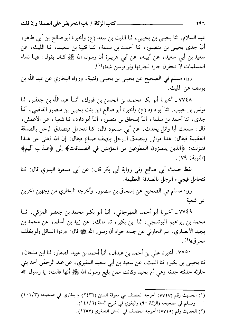 7748 - أَخْبَرَنَا أَبُو بَكْرٍ مُحَمَّدُ بْنُ الْحَسَنِ بْنِ فُورَكٍ، أنبأ عَبْدُ اللهِ بْنُ جَعْفَرٍ، ثنا يُونُسُ بْنُ حَبِيبٍ، ثنا أَبُو دَاوُدَ، ح وَأَخْبَرَنَا أَبُو صَالِحِ ابْنُ بِنْتِ يَحْيَى بْنِ مَنْصُورٍ الْقَاضِي، أنبأ جَدِّي، ثنا أَحْمَدُ بْنُ سَلَمَةَ، أنبأ إِسْحَاقُ بْنُ مَنْصُورٍ، أنبأ أَبُو دَاوُدَ، ثنا شُعْبَةُ، عَنِ الْأَعْمَشِ، قَالَ: سَمِعْتُ أَبَا وَائِلٍ يُحَدِّثُ عَنْ أَبِي مَسْعُودٍ، قَالَ: " كُنَّا نَتَحَامَلُ فَيَتَصَدَّقُ الرَّجُلُ بِالصَّدَقَةِ الْعَظِيمَةِ فَيُقَالُ: هَذَا مُرَائِي، وَيَتَصَدَّقُ الرَّجُلُ بِنِصْفِ صَاعٍ، فَيُقَالُ: إِنَّ اللهَ لَغَنِيٌّ عَنْ هَذَا فَنَزَلَتْ: {§الَّذِينَ يَلْمِزُونَ الْمُطَّوِّعِينَ مِنَ الْمُؤْمِنِينَ فِي الصَّدَقَاتِ} [التوبة: 79] إِلَى {عَذَابٌ أَلِيمٌ} [التوبة: 79] لَفْظُ حَدِيثِ أَبِي صَالِحٍ وَفِي رِوَايَةِ أَبِي بَكْرٍ قَالَ: عَنْ أَبِي مَسْعُودٍ الْبَدْرِيِّ، قَالَ: كُنَّا نَتَحَامَلُ فَيَجِيءُ الرَّجُلُ بِالصَّدَقَةِ الْعَظِيمَةِ. رَوَاهُ مُسْلِمٌ فِي الصَّحِيحِ عَنْ إِسْحَاقَ بْنِ مَنْصُورٍ وَأَخْرَجَهُ الْبُخَارِيُّ مِنْ وَجْهَيْنِ آخَرَيْنِ عَنْ شُعْبَةَ
