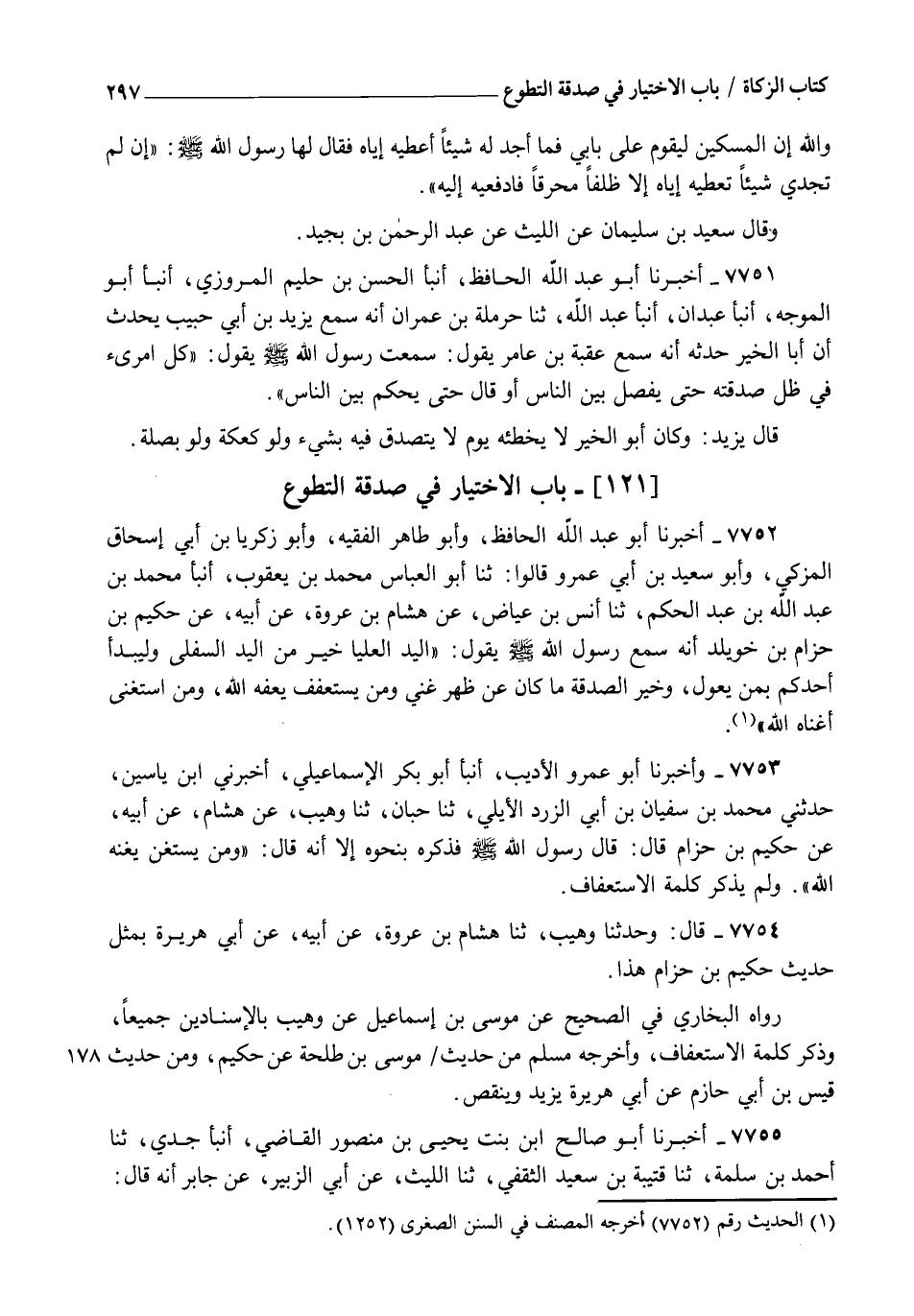7754 - قَالَ: وَحَدَّثَنَا وُهَيْبٌ، ثنا هِشَامُ بْنُ عُرْوَةَ، عَنْ أَبِيهِ، عَنْ أَبِي هُرَيْرَةَ، بِمِثْلِ حَدِيثِ حَكِيمِ بْنِ حِزَامٍ هَذَا. رَوَاهُ الْبُخَارِيُّ فِي الصَّحِيحِ عَنْ مُوسَى بْنِ إِسْمَاعِيلَ، عَنْ وُهَيْبٍ، بِالْإِسْنَادَيْنِ جَمِيعًا وَذَكَرَ كَلِمَةَ الِاسْتِعْفَافِ، وَأَخْرَجَهُ مُسْلِمٌ مِنْ حَدِيثِ مُوسَى بْنِ طَلْحَةَ عَنْ حَكِيمٍ، وَمِنْ حَدِيثِ قَيْسِ بْنِ أَبِي حَازِمٍ عَنْ أَبِي هُرَيْرَةَ، يَزِيدُ وَيَنْقُصُ