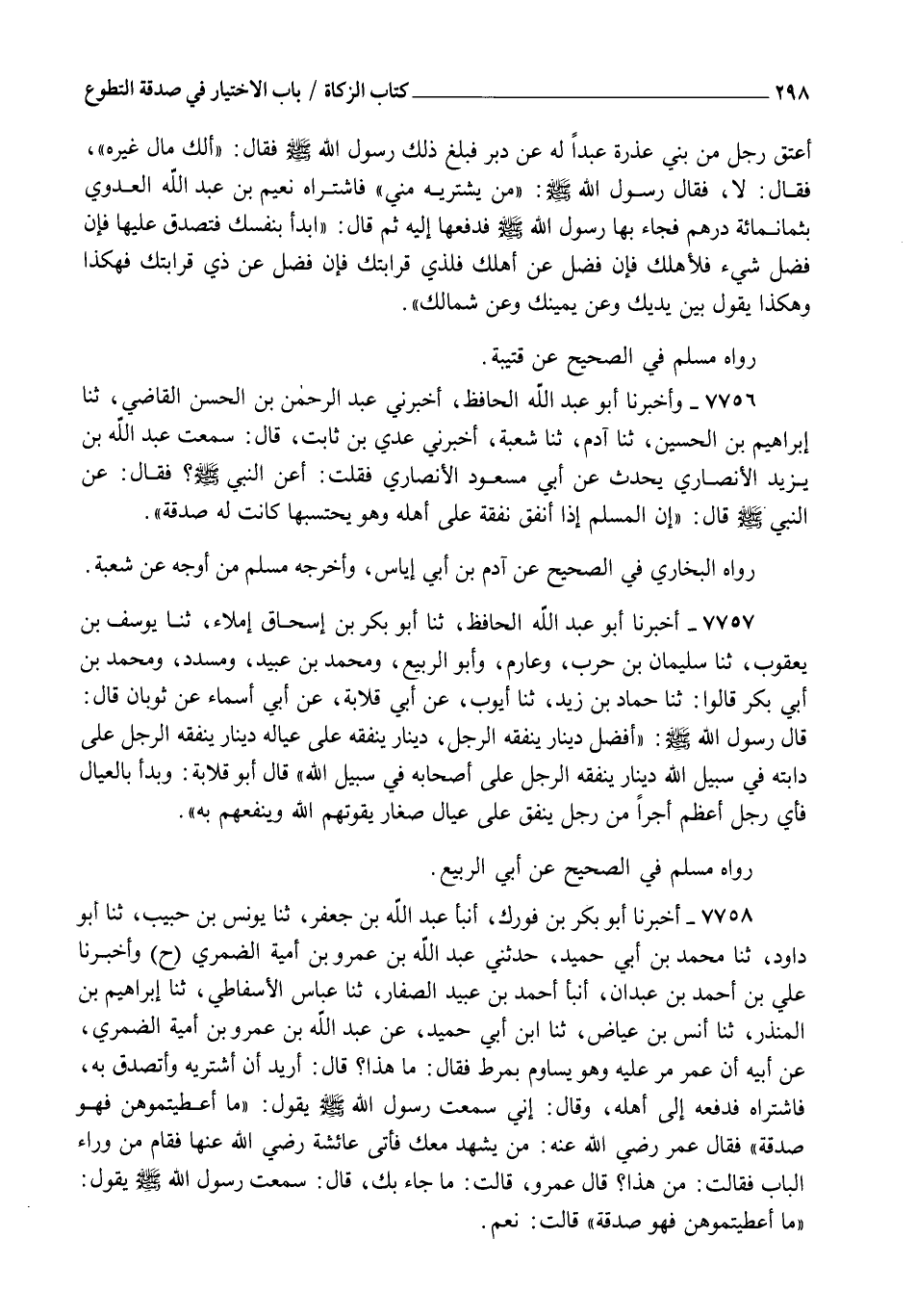7757 - أَخْبَرَنَا أَبُو عَبْدِ اللهِ الْحَافِظُ، ثنا أَبُو بَكْرِ بْنُ إِسْحَاقَ إِمْلَاءً، ثنا يُوسُفُ بْنُ يَعْقُوبَ، ثنا سُلَيْمَانُ بْنُ حَرْبٍ، وَعَارِمٌ، وَأَبُو الرَّبِيعِ، وَمُحَمَّدُ بْنُ عُبَيْدٍ، وَمُسَدَّدٌ، وَمُحَمَّدُ بْنُ أَبِي بَكْرٍ، قَالُوا: ثنا حَمَّادُ بْنُ زَيْدٍ، ثنا أَيُّوبُ، عَنْ أَبِي قِلَابَةَ، عَنْ أَبِي أَسْمَاءَ، عَنْ ثَوْبَانَ، قَالَ: قَالَ رَسُولُ اللهِ صَلَّى اللهُ عَلَيْهِ وَسَلَّمَ: " §أَفْضَلُ دِينَارٍ يُنْفِقُهُ الرَّجُلُ دِينَارٌ يُنْفِقُهُ عَلَى عِيَالِهِ، دِينَارٌ يُنْفِقُهُ الرَّجُلُ عَلَى دَابَّتِهِ فِي سَبِيلِ اللهِ، دِينَارٌ يُنْفِقُهُ الرَّجُلُ عَلَى أَصْحَابِهِ فِي سَبِيلِ اللهِ " قَالَ أَبُو قِلَابَةَ: وَبَدَأَ بِالْعِيَالِ، فَأِيُّ رَجُلٍ أَعْظَمُ أَجْرًا مِنْ رَجُلٍ يُنْفِقُ عَلَى عِيَالٍ صِغَارٍ يَقُوتُهُمُ اللهُ وَيَنْفَعُهُمْ بِهِ رَوَاهُ مُسْلِمٌ فِي الصَّحِيحِ عَنْ أَبِي الرَّبِيعِ
