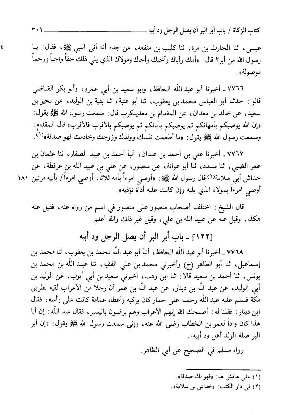7768 - أَخْبَرَنَا أَبُو عَبْدِ اللهِ الْحَافِظُ، أنبأ أَبُو عَبْدِ اللهِ مُحَمَّدُ بْنُ يَعْقُوبَ، ثنا مُحَمَّدُ بْنُ إِسْمَاعِيلَ، ثنا أَبُو الطَّاهِرِ، ح وَأَخْبَرَنِي مُحَمَّدُ بْنُ عَلِيٍّ الْفَقِيهُ، ثنا عَبْدُ اللهِ بْنُ مُحَمَّدِ بْنِ يُونُسَ، ثنا أَحْمَدُ بْنُ سَعِيدٍ، قَالَا: ثنا ابْنُ وَهْبٍ، أَخْبَرَنِي سَعِيدُ بْنُ أَبِي أَيُّوبَ، عَنِ الْوَلِيدِ بْنِ أَبِي الْوَلِيدِ، عَنْ عَبْدِ اللهِ بْنِ دِينَارٍ، عَنْ عَبْدِ اللهِ بْنِ عُمَرَ: أَنَّ رَجُلًا مِنَ الْأَعْرَابِ لَقِيَهُ بِطَرِيقِ مَكَّةَ فَسَلَّمَ عَلَيْهِ عَبْدُ اللهِ، وَحَمَلَهُ عَلَى حِمَارٍ كَانَ يَرْكَبُهُ، وَأَعْطَاهُ عِمَامَةً كَانَتْ عَلَى رَأْسِهِ، فَقَالَ ابْنُ دِينَارٍ: فَقُلْنَا لَهُ: أَصْلَحَكَ اللهُ، إِنَّهُمُ الْأَعَرَابُ، وَهُمْ يَرْضَوْنَ بِالْيَسِيرِ، فَقَالَ عَبْدُ اللهِ، إِنَّ أَبَا هَذَا كَانَ وَادًّا لِعُمَرَ بْنِ الْخَطَّابِ رَضِيَ اللهُ عَنْهُ، وَإِنِّي سَمِعْتُ رَسُولَ اللهِ صَلَّى اللهُ عَلَيْهِ وَسَلَّمَ يَقُولُ: " إِنَّ §أَبَرَّ الْبِرِّ صِلَةُ الْوَلَدِ أَهْلَ وُدِّ أَبِيهِ " رَوَاهُ مُسْلِمٌ فِي الصَّحِيحِ عَنْ أَبِي الطَّاهِرِ