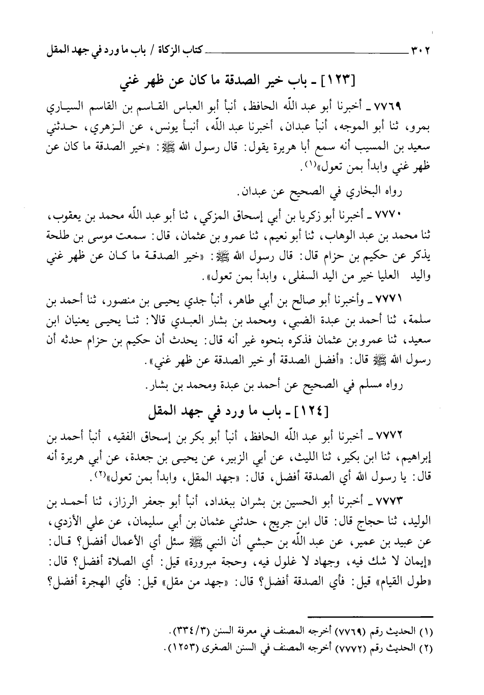 7769 - أَخْبَرَنَا أَبُو عَبْدِ اللهِ الْحَافِظُ، أنبأ أَبُو الْعَبَّاسِ الْقَاسِمُ بْنُ الْقَاسِمِ السَّيَّارِيُّ بِمَرْوٍ، ثنا أَبُو الْمُوَجِّهِ، أنبأ عَبْدَانُ، أَخْبَرَنَا عَبْدُ اللهِ، أنبأ يُونُسُ، عَنِ الزُّهْرِيِّ، حدَّثَنِي سَعِيدُ بْنُ الْمُسَيِّبِ، أَنَّهُ سَمِعَ أَبَا هُرَيْرَةَ، يَقُولُ: قَالَ رَسُولُ اللهِ صَلَّى اللهُ عَلَيْهِ وَسَلَّمَ: " §خَيْرُ الصَّدَقَةِ مَا كَانَ عَنْ ظَهْرِ غِنًى، وَابْدَأْ بِمَنْ تَعُولُ " رَوَاهُ الْبُخَارِيُّ فِي الصَّحِيحِ عَنْ عَبْدَانَ