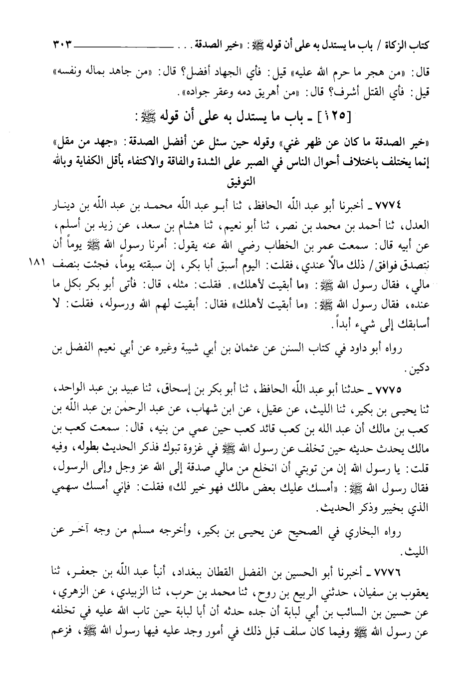 7775 - حَدَّثَنَا أَبُو عَبْدِ اللهِ الْحَافِظُ، ثنا أَبُو بَكْرِ بْنُ إِسْحَاقَ، ثنا عُبَيْدُ بْنُ عَبْدِ الْوَاحِدِ، ثنا يَحْيَى بْنُ بُكَيْرٍ، ثنا اللَّيْثُ، عَنْ عُقَيْلٍ، عَنِ ابْنِ شِهَابٍ، عَنْ عَبْدِ الرَّحْمَنِ بْنِ عَبْدِ اللهِ بْنِ كَعْبِ بْنِ مَالِكٍ، أَنَّ عَبْدَ اللهِ بْنَ كَعْبٍ قَائِدَ كَعْبٍ حِينَ عَمِيَ مِنْ بَنِيهِ، قَالَ: سَمِعْتُ كَعْبَ بْنَ مَالِكٍ، يُحَدِّثُ حَدِيثَهُ حِينَ تَخَلَّفَ عَنْ رَسُولِ اللهِ صَلَّى اللهُ عَلَيْهِ وَسَلَّمَ فِي غَزْوَةِ تَبُوكَ فَذَكَرَ الْحَدِيثَ بِطُولِهِ وَفِيهِ قُلْتُ: يَا رَسُولَ اللهِ، إِنَّ مِنْ تَوْبَتِي أَنْ أَنْخَلِعَ مِنْ مَالِي صَدَقَةً إِلَى اللهِ عَزَّ وَجَلَّ، وَإِلَى الرَّسُولِ، فَقَالَ رَسُولُ اللهِ صَلَّى اللهُ عَلَيْهِ وَسَلَّمَ: " §أَمْسِكْ عَلَيْكَ بَعْضَ مَالِكَ، فَهُوَ خَيْرٌ لَكَ "، فَقُلْتُ: فَإِنِّي أَمْسِكُ سَهْمِيَ الَّذِي بِخَيْبَرَ، وَذَكَرَ الْحَدِيثَ. رَوَاهُ الْبُخَارِيُّ فِي الصَّحِيحِ عَنْ يَحْيَى بْنِ بُكَيْرٍ، وَأَخْرَجَهُ مُسْلِمٌ مِنْ وَجْهٍ آخَرَ عَنِ اللَّيْثِ