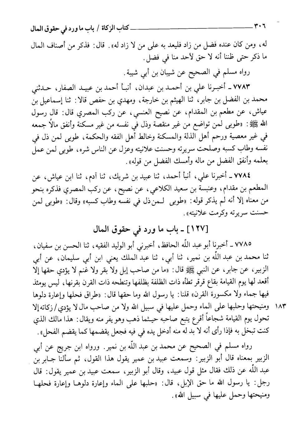 7785 - أَخْبَرَنَا أَبُو عَبْدِ اللهِ الْحَافِظُ، أَخْبَرَنِي أَبُو الْوَلِيدِ الْفَقِيهُ، ثنا الْحَسَنُ بْنُ سُفْيَانَ، ثنا مُحَمَّدُ بْنُ عَبْدِ اللهِ بْنِ نُمَيْرٍ، ثنا أَبِي، ثنا عَبْدُ الْمَلِكِ يَعْنِي ابْنَ أَبِي سُلَيْمَانَ، عَنْ أَبِي الزُّبَيْرِ، عَنْ جَابِرٍ، عَنِ النَّبِيِّ صَلَّى اللهُ عَلَيْهِ وَسَلَّمَ , قَالَ: " §مَا مِنْ صَاحِبِ إِبِلٍ، وَلَا بَقَرٍ، وَلَا غَنَمٍ، لَا يُؤَدِّي حَقَّهَا، إِلَّا أُقْعِدَ لَهَا يَوْمَ الْقِيَامَةِ بِقَاعٍ قَرْقَرٍ، تَطَؤُهُ ذَاتُ الظِّلْفَةِ بِظِلْفِهَا، وَتَنْطَحُهُ ذَاتُ الْقَرْنِ بِقَرْنِهَا، لَيْسَ يَوْمَئِذٍ فِيهَا جَمَّاءُ وَلَا مَكْسُورَةُ الْقَرْنِ " قُلْنَا: يَا رَسُولَ اللهِ، وَمَا حَقُّهَا؟ قَالَ: " إِطْرَاقُ فَحْلِهَا , وَإِعَارَةُ دَلْوِهَا، وَمَنِيحَتِهَا، وَحَلَبُهَا عَلَى الْمَاءِ، وَحَمَلٌ عَلَيْهَا فِي سَبِيلِ اللهِ، وَلَا مِنْ صَاحِبِ مَالٍ لَا يُؤَدِّي زِكْوَتَهَ إِلَّا تَحَوَّلَ يَوْمَ الْقِيَامَةِ شُجَاعًا أَقْرَعَ يَتْبَعُ صَاحِبَهُ حَيْثُمَا ذَهَبَ وَهُوَ يَفِرُّ مِنْهُ , وَيُقَالُ: هَذَا مَالِكٌ الَّذِي كُنْتَ تَبْخَلُ بِهِ , فَإِذَا رَأَى أَنَّهُ لَا بُدَّ لَهُ مِنْهُ أَدْخَلَ يَدَهُ فِي فِيهِ فَجَعَلَ يَقْضَمُهَا كَمَا يَقْضَمُ الْفَحْلُ " رَوَاهُ مُسْلِمٌ فِي الصَّحِيحِ عَنْ مُحَمَّدِ بْنِ عَبْدِ اللهِ بْنِ نُمَيْرٍ وَرَوَاهُ ابْنُ جُرَيْجٍ عَنْ أَبِي الزُّبَيْرِ بِمَعْنَاهُ. قَالَ أَبُو الزُّبَيْرِ وَسَمِعْتُ عُبَيْدَ بْنَ عُمَيْرٍ يَقُولُ هَذَا الْقَوْلَ، ثُمَّ سَأَلْنَا جَابِرَ بْنَ عَبْدِ اللهِ عَنْ ذَلِكَ , فَقَالَ مِثْلَ قَوْلِ عُبَيْدٍ، وَقَالَ أَبُو الزُّبَيْرِ سَمِعْتُ عُبَيْدَ بْنَ عُمَيْرٍ يَقُولُ: قَالَ رَجُلٌ: يَا رَسُولَ اللهِ، مَا حَقُّ الْإِبِلِ؟ قَالَ: " حَلْبُهَا عَلَى الْمَاءِ، وَإِعَارَةُ دَلْوِهَا، وَإِعَارَةُ فَحْلِهَا، وَمَنِيحَتِهَا، وَحَمْلٌ عَلَيْهَا فِي سَبِيلِ اللهِ " -[307]-