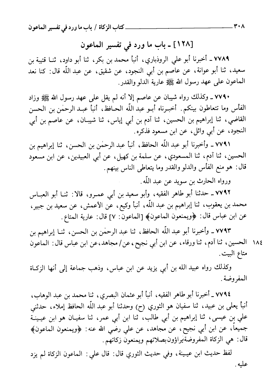 7793 - وَأَخْبَرَنَا أَبُو عَبْدِ اللهِ الْحَافِظُ، ثنا عَبْدُ الرَّحْمَنِ بْنُ الْحَسَنِ، ثنا إِبْرَاهِيمُ بْنُ الْحُسَيْنِ، ثنا آدَمُ، ثنا وَرْقَاءُ، عَنِ ابْنِ أَبِي نَجِيحٍ، عَنْ مُجَاهِدٍ، عَنِ ابْنِ عَبَّاسٍ، قَالَ: §" الْمَاعُونُ مَتَاعُ الْبَيْتِ " وَكَذَلِكَ رَوَاهُ عُبَيْدُ اللهِ بْنُ أَبِي يَزِيدَ عَنِ ابْنِ عَبَّاسٍ وَذَهَبَ جَمَاعَةٌ إِلَى أَنَّهَا الزَّكَاةُ الْمَفْرُوضَةُ
