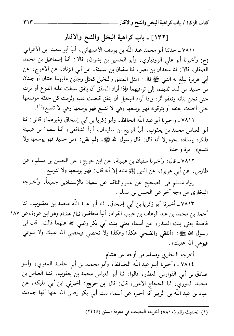 7810 - حَدَّثَنَا أَبُو مُحَمَّدٍ عَبْدُ اللهِ بْنُ يُوسُفَ الْأَصْبَهَانِيُّ، أنبأ أَبُو سَعِيدِ بْنُ الْأَعْرَابِيِّ، ح وَأَخْبَرَنَا أَبُو عَلِيٍّ الرُّوذْبَارِيُّ، وَأَبُو الْحُسَيْنِ بْنُ بِشْرَانَ، قَالَ: أنبأ إِسْمَاعِيلُ بْنُ مُحَمَّدٍ الصَّفَّارُ، قَالَ: ثنا سَعْدَانُ بْنُ نَصْرٍ، ثنا سُفْيَانُ بْنُ عُيَيْنَةَ، عَنْ أَبِي الزِّنَادِ، عَنِ الْأَعْرَجِ، عَنْ أَبِي هُرَيْرَةَ، يَبْلُغُ بِهِ النَّبِيَّ صَلَّى اللهُ عَلَيْهِ وَسَلَّمَ، قَالَ: §" مَثَلُ الْمُنْفِقِ وَالْبَخِيلِ كَمَثَلِ رَجُلَيْنِ عَلَيْهِمَا جُنَّتَانِ، أَوْ جُبَّتَانِ مِنْ حَدِيدٍ مِنْ لَدُنْ ثَدْيَيْهِمَا إِلَى تَرَاقِيهِمَا، فَإِذَا أَرَادَ الْمُنْفِقُ أَنْ يُنْفِقَ سُبِغَتْ عَلَيْهِ الدِّرْعُ، أَوْ مَرَّتْ حَتَّى تُجِنَّ بَنَانَهُ، وَتَعْفُوَ أَثَرَهُ، وَإِذَا أَرَادَ الْبَخِيلُ أَنْ يُنْفِقَ قَلَصَتْ عَلَيْهِ، وَلَزِمَتْ كُلُّ حَلْقَةٍ مَوْضِعَهَا حَتَّى أَخَذَتْ بِعُنُقِهِ، أَوْ بِتَرْقُوَتِهِ، فَهُوَ يُوَسِّعُهَا وَهِيَ لَا تَتَّسِعُ، فَهُوَ يُوَسِّعُهَا وَهِيَ لَا تَتَّسِعُ "