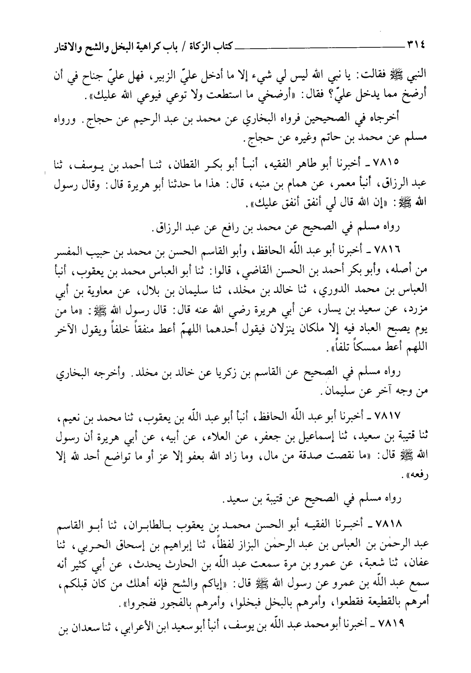 7816 - أَخْبَرَنَا أَبُو عَبْدِ اللهِ الْحَافِظُ، وَأَبُو الْقَاسِمِ الْحَسَنُ بْنُ مُحَمَّدِ بْنِ حَبِيبٍ الْمُفَسِّرُ، مِنْ أَصْلِهِ، وَأَبُو بَكْرٍ أَحْمَدُ بْنُ الْحَسَنِ الْقَاضِي، قَالُوا: ثنا أَبُو الْعَبَّاسِ مُحَمَّدُ بْنُ يَعْقُوبَ، أنبأ الْعَبَّاسُ بْنُ مُحَمَّدٍ الدُّورِيُّ، ثنا خَالِدُ بْنُ مَخْلَدٍ، ثنا سُلَيْمَانُ بْنُ بِلَالٍ، عَنْ مُعَاوِيَةَ بْنِ أَبِي مُزَرِّدٍ، عَنْ سَعِيدِ بْنِ يَسَارٍ، عَنْ أَبِي هُرَيْرَةَ رَضِيَ اللهُ عَنْهُ قَالَ: قَالَ رَسُولُ اللهِ صَلَّى اللهُ عَلَيْهِ وَسَلَّمَ: §" مَا مِنْ يوْمٍ يُصْبِحُ الْعِبَادُ فِيهِ إِلَّا مَلَكَانِ يَنْزِلَانِ فَيَقُولُ أَحَدُهُمَا: اللهُمَّ أَعْطِ مُنْفِقًا خَلَفًا، وَيَقُولُ الْآخَرُ اللهُمَّ أَعْطِ مُمْسِكًا تَلَفًا ". رَوَاهُ مُسْلِمٌ فِي الصَّحِيحِ عَنِ الْقَاسِمِ بْنِ زَكَرِيَّا عَنْ خَالِدِ بْنِ مَخْلَدٍ، وَأَخْرَجَهُ الْبُخَارِيُّ مِنْ وَجْهٍ آخَرَ عَنْ سُلَيْمَانَ