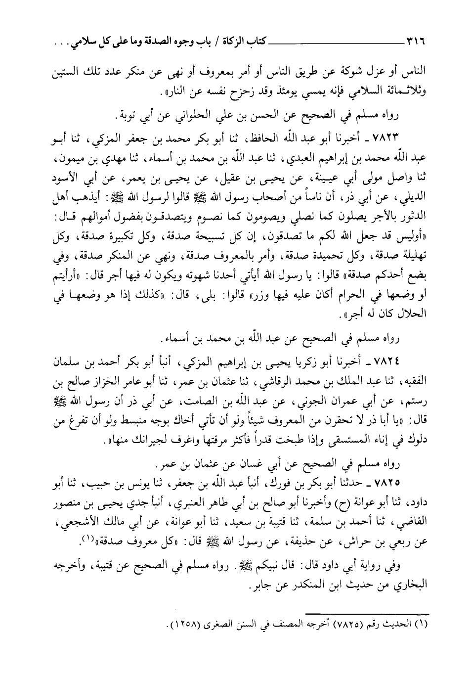 7825 - حَدَّثَنَا أَبُو بَكْرِ بْنُ فُورَكٍ، أنبأ عَبْدُ اللهِ بْنُ جَعْفَرٍ، ثنا يُونُسُ بْنُ حَبِيبٍ، ثنا أَبُو دَاوُدَ، ثنا أَبُو عَوَانَةَ، ح وَأَخْبَرَنَا أَبُو صَالِحِ بْنُ أَبِي طَاهِرٍ الْعَنْبَرِيُّ، أنبأ جَدِّي يَحْيَى بْنُ مَنْصُورٍ الْقَاضِي، ثنا أَحْمَدُ بْنُ سَلَمَةَ، ثنا قُتَيْبَةُ بْنُ سَعِيدٍ، ثنا أَبُو عَوَانَةَ، عَنْ أَبِي مَالِكٍ الْأَشْجَعِيِّ، عَنْ رِبْعِيِّ بْنِ حِرَاشٍ، عَنْ حُذَيْفَةَ، عَنْ رَسُولِ اللهِ صَلَّى اللهُ عَلَيْهِ وَسَلَّمَ قَالَ: " §كُلُّ مَعْرُوفٍ صَدَقَةٌ " وَفِي رِوَايَةِ أَبِي دَاوُدَ قَالَ: قَالَ نَبِيُّكُمْ صَلَّى اللهُ عَلَيْهِ وَسَلَّمَ. رَوَاهُ مُسْلِمٌ فِي الصَّحِيحِ عَنْ قُتَيْبَةَ، وَأَخْرَجَهُ الْبُخَارِيُّ مِنْ حَدِيثِ ابْنِ الْمُنْكَدِرِ عَنْ جَابِرٍ