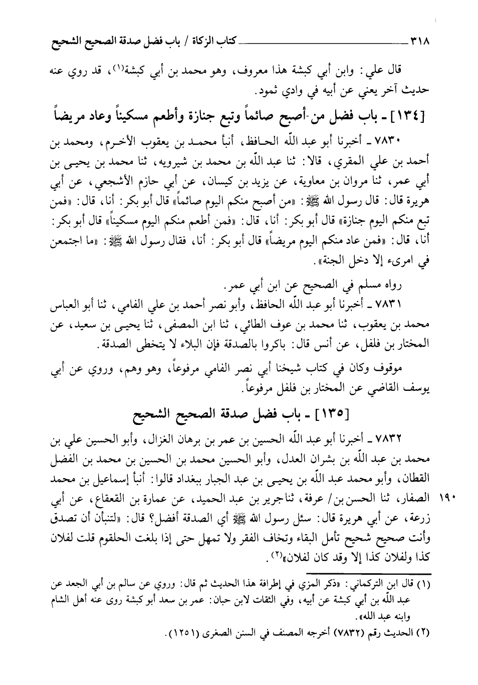 7830 - أَخْبَرَنَا أَبُو عَبْدِ اللهِ الْحَافِظُ، أنبأ مُحَمَّدُ بْنُ يَعْقُوبَ الْأَخْرَمُ، وَمُحَمَّدُ بْنُ أَحْمَدَ بْنِ عَلِيٍّ الْمُقْرِئُ، قَالَ: ثنا عَبْدُ اللهِ بْنُ مُحَمَّدِ بْنِ شِيرَوَيْهِ، ثنا مُحَمَّدُ بْنُ يَحْيَى بْنِ أَبِي عُمَرَ، ثنا مَرْوَانُ بْنُ مُعَاوِيَةَ، عَنْ يَزِيدَ بْنِ كَيْسَانَ، عَنْ أَبِي حَازِمٍ الْأَشْجَعِيِّ، عَنْ أَبِي هُرَيْرَةَ قَالَ: قَالَ رَسُولُ اللهِ صَلَّى اللهُ عَلَيْهِ وَسَلَّمَ: §" مَنْ أَصْبَحَ مِنْكُمُ الْيَوْمَ صَائِمًا؟ " قَالَ أَبُو بَكْرٍ: أَنَا، قَالَ: " فَمَنْ تَبِعَ مِنْكُمُ الْيَوْمَ جِنَازَةً؟ "، قَالَ أَبُو بَكْرٍ: أَنَا، قَالَ: " فَمَنْ أَطْعَمَ مِنْكُمُ الْيَوْمَ مِسْكِينًا؟ " قَالَ أَبُو بَكْرٍ: أَنَا، قَالَ: " فَمَنْ عَادَ مِنْكُمُ الْيَوْمَ مَرِيضًا؟ " قَالَ أَبُو بَكْرٍ: أَنَا، فَقَالَ رَسُولُ اللهِ صَلَّى اللهُ عَلَيْهِ وَسَلَّمَ: " مَا اجْتَمَعْنَ فِي امْرِئٍ إِلَّا دَخَلَ الْجَنَّةَ " رَوَاهُ مُسْلِمٌ فِي الصَّحِيحِ عَنِ ابْنِ أَبِي عُمَرَ