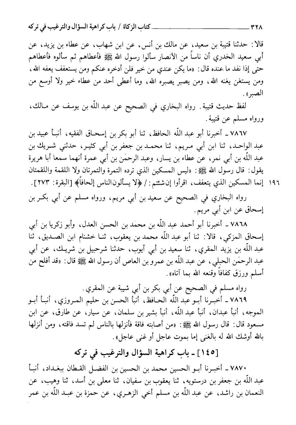 7870 - أَخْبَرَنَا أَبُو الْحُسَيْنِ مُحَمَّدُ بْنُ الْحُسَيْنِ بْنِ الْفَضْلِ الْقَطَّانُ بِبَغْدَادَ، أنبأ عَبْدُ اللهِ بْنُ جَعْفَرِ بْنِ دَرَسْتَوَيْهِ، ثنا يَعْقُوبُ بْنُ سُفْيَانَ، ثنا مُعَلَّى بْنُ أَسَدٍ، ثنا وُهَيْبٌ، عَنِ النُّعْمَانِ بْنِ رَاشِدٍ، عَنْ عَبْدِ اللهِ بْنِ مُسْلِمٍ أَخِي الزُّهْرِيِّ، عَنْ حَمْزَةَ بْنِ عَبْدِ اللهِ بْنِ عُمَرَ، -[329]- قَالَ: خَرَجْنَا إِلَى الشَّامِ نَسْأَلُ قَالَ: فَلَمَّا قَدِمْنَا الْمَدِينَةَ، قَالَ لَنَا ابْنُ عُمَرَ: أَتَيْتُمُ الشَّامَ تَسْأَلُونَ أَمَا إِنِّي سَمِعْتُ رَسُولَ اللهِ صَلَّى اللهُ عَلَيْهِ وَسَلَّمَ يَقُولُ: §" مَا تَزَالُ الْمَسْأَلَةُ بِالرَّجُلِ حَتَّى يَلْقَى اللهَ وَمَا فِي وَجْهِهِ مُزْعَةٌ مِنْ لَحْمٍ " أَخْرَجَهُ الْبُخَارِيُّ فِي الصَّحِيحِ فَقَالَ: وَقَالَ مُعَلَّى بْنُ أَسَدٍ فَذَكَرَهُ، وَأَخْرَجَهُ مُسْلِمٌ مِنْ حَدِيثِ مَعْمَرٍ عْنْ عَبْدِ اللهِ بْنِ مُسْلِمٍ مُخْتَصَرًا